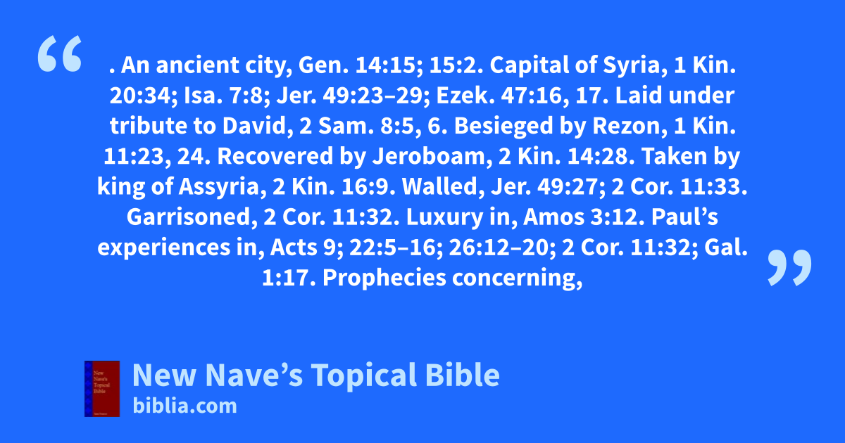 DAMASCUS. An ancient city, Gen. 14:15; 15:2. Capital of Syria, 1 Kin. 20:34; Isa. 7:8; Jer. 49:23–29; Ezek. 47:16, 17. Laid under tribute to David, 2 Sam. 8:5, 6. Besieged by Rezon, 1 Kin. 11:23, 24. Recovered by Jeroboam, 2 Kin. 14:28. Taken by king of Assyria, 2 Kin. 16:9. Walled, Jer. 49:27; 2 Cor. 11:33. Garrisoned, 2 Cor. 11:32. Luxury in, Amos 3:12. Paul’s experiences in, Acts 9; 22:5–16; 26:12–20; 2 Cor. 11:32; Gal. 1:17. Prophecies concerning, Isa. 8:4; 17:1, 2; Jer. 49:23–29; Amos 1:3, 5; Zech. 9:1. Wilderness of, 1 Kin. 19:15. See Syria.
