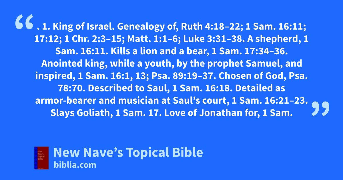 DAVID. 1. King of Israel. Genealogy of, Ruth 4:18–22; 1 Sam. 16:11; 17:12; 1 Chr. 2:3–15; Matt. 1:1–6; Luke 3:31–38. A shepherd, 1 Sam. 16:11. Kills a lion and a bear, 1 Sam. 17:34–36. Anointed king, while a youth, by the prophet Samuel, and inspired, 1 Sam. 16:1, 13; Psa. 89:19–37. Chosen of God, Psa. 78:70. Described to Saul, 1 Sam. 16:18. Detailed as armor-bearer and musician at Saul’s court, 1 Sam. 16:21–23. Slays Goliath, 1 Sam. 17. Love of Jonathan for, 1 Sam. 18:1–4. Popularity and discreetness of, 1 Sam. 18. Saul’s jealousy of, 1 Sam. 18:8–30. Is defrauded of Merab, and given Michal to wife, 1 Sam. 18:17–27. Jonathan intercedes for, 1 Sam. 19:1–7. Probably writes Psalm 11 at this period of his life. Conducts a campaign against, and defeats, the Philistines, 1 Sam. 19:8. Saul attempts to slay him; he escapes to Ramah, and dwells at Naioth, to there Saul pursues him, 1 Sam. 19:9–24. About this time writes Psalm 59. Returns, and Jonathan makes covenant with him, 1 Sam. 20. Escapes by way of Nob, where he obtains consecrated bread and Goliath’s sword from Abimelech, 1 Sam. 21:1–6; Matt. 12:3, 4; to Gath, 1 Sam. 21:10–15. At this time probably writes Psalms 34; 35; 52; 56; 120. Recruits an army of insurgents, goes to Moab, returns to Hareth, 1 Sam. 22. Probably writes Psalms 17; 35; 52; 58; 64; 109; 142. Saves Keilah, 1 Sam. 23:1–13. Makes second covenant with Jonathan, 1 Sam. 23:16–18. Goes to the wilderness of Ziph, is betrayed to Saul, 1 Sam. 23:13–26. Writes a psalm on the betrayal, Psalm 54, and probably Psalms 22; 31; 140. Saul is diverted from pursuit of, 1 Sam. 23:27, 28. At this time probably writes Psalm 12. Goes to En-gedi, 1 Sam. 23:29. Refrains from slaying Saul, 1 Sam. 24. Writes Psalm 57. Covenants with Saul, 1 Sam. 26. Marries Nabal’s widow, Abigail, and Ahinoam, 1 Sam. 25. Dwells in the wilderness of Ziph, has opportunity to slay Saul, but takes his spear only. Saul is contrite, 1 Sam. 26. Flees to Achish and dwells in Ziklag, 1 Sam. 27. List of men who join him, 1 Chr. 12:1–22. Conducts an expedition against Amalekites, misstates the facts to Achish, 1 Sam. 27:8–12. At this time probably writes Psalm 141. Is refused permission to accompany the Philistines to battle against the Israelites, 1 Sam. 28:1, 2; 29. Rescues the people of Ziklag, who had been captured by the Amalekites, 1 Sam. 30. Probably writes Psalm 13. Death and burial of Saul and his sons, 1 Sam. 31; 2 Sam. 21:1–14. Slays the murderer of Saul, 2 Sam. 1:1–16. Lamentation over Saul, 2 Sam. 1:17–27. After dwelling one year and four months at Ziklag, 1 Sam. 27:7, goes to Hebron, and is anointed king by Judah, 2 Sam. 2:1–4, 11; 5:5; 1 Kin. 2:11; 1 Chr. 3:4; 11:1–3. List of those who join him at Hebron, 1 Chr. 12:23–40. Ish-bosheth, son of Saul, crowned, 2 Sam. 2–4. David wages war against, and defeats, Ish-bosheth, 2 Sam. 2:13–32; 3:4. Demands the restoration of Michal, his wife, 2 Sam. 3:14–16. Abner revolts from Ish-bosheth, and joins David, but is slain by Joab, 2 Sam. 3. Punishes Ish-bosheth’s murderers, 2 Sam. 4. Anointed king over all Israel, after reigning over Judah at Hebron seven years and six months, and reigns thirty-three years, 2 Sam. 2:11; 5:5; 1 Chr. 3:4; 11:1–3; 12:23–40; 29:27. Makes conquest of Jerusalem, 2 Sam. 5:6; 1 Chr. 11:4–8; Isa. 29:1. Builds a palace, 2 Sam. 5:11; 2 Chr. 2:3. Friendship of, with Hiram, king of Tyre, 2 Sam. 5:11; 1 Kin. 5:1. Prospered of God, 2 Sam. 5:10, 12; 1 Chr. 11:9. Fame of, 1 Chr. 14:17. Philistines make war against, and are defeated by him, 2 Sam. 5:17, 25. Assembles thirty thousand men to escort the ark to Jerusalem with music and thanksgiving, 2 Sam. 6:1–5. Uzzah is stricken when he attempts to steady the ark, 2 Sam. 6:6–11. David is terrified, and leaves the ark at the house of Obed-edom, 2 Sam. 6:9–11. After three months brings the ark to Jerusalem with dancing and great joy, 2 Sam. 6:12–16; 1 Chr. 13. Organized the tabernacle service, 1 Chr. 9:22; 15:16–24; 16:4–6, 37–43. Offers sacrifice, distributes gifts, and blesses the people, 2 Sam. 6:17–19. Michal rebukes him for his religious enthusiasm, 2 Sam. 6:20–23. Desires to build a temple, is forbidden, but receives promise that his seed should reign forever, 2 Sam. 7:12–16; 23:5; 1 Chr. 17:11–14; 2 Chr. 6:16; Psa. 89:3, 4; 132:11, 12; Acts 15:16; Rom. 15:12. Interpretation and fulfillment of this prophecy, Acts 13:22, 23. At this time, probably, writes Psalms 15; 16; 24; 101; 138. Conquers the Philistines, Moabites, and Syria, 2 Sam. 8. Treats Mephibosheth, the lame son of Saul, with great kindness, 2 Sam. 9:6; 19:24–30. Sends commissioners with a message of sympathy to Hanun, son of the king of Ammon; the message misinterpreted, and commissioners treated with indignity; David retaliates by invading his kingdom, and defeating the combined armies of the Ammonites and Syrians, 2 Sam. 10; 1 Chr. 19. Probably writes Psalms 18; 20; 21. Commits adultery with Bath-sheba, 2 Sam. 11:2–5. Wickedly causes the death of Uriah, 2 Sam. 11:6–25. Takes Bath-sheba to be his wife, 2 Sam. 11:26, 27. Is rebuked by the prophet Nathan, 2 Sam. 12:1–14. Repents of his crime and confesses his guilt, Psa. 6; 32; 38; 39; 40; 51. Is chastised with grievous affliction on account of his crime, Psa. 38; 41; 69. Death of his infant son by Bath-sheba, 2 Sam. 12:15–23. Solomon is born to, 2 Sam. 12:24, 25. Ammonites defeated and tortured, 2 Sam. 12:26–31. Amnon’s crime, his murder by Absalom, and Absalom’s flight, 2 Sam. 13. Absalom’s return, 2 Sam. 14:1–24. Absalom’s usurpation, 2 Sam. 14; 15. David’s flight from Jerusalem, 2 Sam. 15:13–37. He probably writes, at this time, Psalms 5; 7; 26; 61; 63; 69; 70; 86; 143. Shimei curses him, 2 Sam. 16. Crosses the Jordan, 2 Sam. 17:21–29. Absalom’s defeat and death, 2 Sam. 18. Laments the death of Absalom, 2 Sam. 18:33; 19:1–4. Rebuked by Joab, 2 Sam. 19:5–7. David rebuk