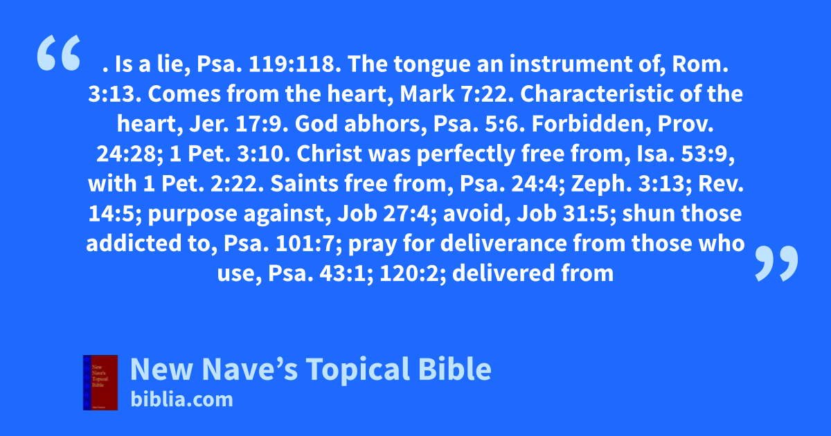 DECEIT. Is a lie, Psa. 119:118. The tongue an instrument of, Rom. 3:13. Comes from the heart, Mark 7:22. Characteristic of the heart, Jer. 17:9. God abhors, Psa. 5:6. Forbidden, Prov. 24:28; 1 Pet. 3:10. Christ was perfectly free from, Isa. 53:9, with 1 Pet. 2:22. Saints free from, Psa. 24:4; Zeph. 3:13; Rev. 14:5; purpose against, Job 27:4; avoid, Job 31:5; shun those addicted to, Psa. 101:7; pray for deliverance from those who use, Psa. 43:1; 120:2; delivered from those who use, Psa. 72:14; should beware of those who teach, Eph. 5:6; Col. 2:8; should lay aside, in seeking truth, 1 Pet. 2:1. Ministers should lay aside, 2 Cor. 4:2; 1 Thess. 2:3. The wicked are full of, Rom. 1:29; devise, Psa. 35:20; 38:12; Prov. 12:5; utter, Psa. 10:7; 36:3; work, Prov. 11:18; increase in, 2 Tim. 3:13; use, to each other, Jer. 9:5; use, to themselves, Jer. 37:9; Obad. 3, 7; delight in, Prov. 20:17. False teachers are workers of, 2 Cor. 11:13; preach, Jer. 14:14; 23:26; impose on others by, Rom. 16:18; Eph. 4:14; revelling in deceit, 2 Pet. 2:13. Hypocrites devise, Job 15:35. Hypocrites practice, Hos. 11:12. False witnesses use, Prov. 12:17. A characteristic of antichrist, 2 John 7. Characteristic of the apostasy, 2 Thess. 2:10. Evil of: hinders knowledge of God, Jer. 9:6. Keeps from turning to God, Jer. 8:5. Leads to pride and oppression, Jer. 5:27, 28; to lying, Prov. 14:25. Often accompanied by fraud and injustice, Psa. 10:7; 43:1. Hatred often concealed by, Prov. 26:24–26. The folly of fools is, Prov. 14:8. The kisses of an enemy are, Prov. 27:6. Blessedness of being free from, Psa. 24:4, 5; 32:2. Punishment of, Psa. 55:23; Jer. 9:7–9.—Bible Text Book. See Confidence, False; Deception; Lies and Deceits; Flattery; Hypocrisy; Lies and Deceits.