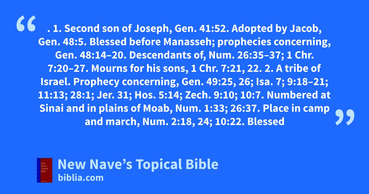 EPHRAIM. 1. Second son of Joseph, Gen. 41:52. Adopted by Jacob, Gen. 48:5. Blessed before Manasseh; prophecies concerning, Gen. 48:14–20. Descendants of, Num. 26:35–37; 1 Chr. 7:20–27. Mourns for his sons, 1 Chr. 7:21, 22. 2. A tribe of Israel. Prophecy concerning, Gen. 49:25, 26; Isa. 7; 9:18–21; 11:13; 28:1; Jer. 31; Hos. 5:14; Zech. 9:10; 10:7. Numbered at Sinai and in plains of Moab, Num. 1:33; 26:37. Place in camp and march, Num. 2:18, 24; 10:22. Blessed by Moses, Deut. 33:13–17. Territory allotted to, after the conquest of Canaan, Josh. 16:5–9; 17:9, 10, 15–18; 1 Chr. 7:28, 29. Fail to expel the Canaanites, Josh. 16:10. Take Beth-el in battle, Judg. 1:22–25. Criticizing Gideon for not summoning them to join the war against the Midianites, Judg. 8:1. Join Gideon against the Midianites, Judg. 7:24, 25. Their jealousy of Jephthah, Judg. 12:1. Defeated by Him, Judg. 12:4–6. Receive Ish-bosheth as king, 2 Sam. 2:9. Jeroboam set up a golden calf in Beth-el, 1 Kin. 12:29. Revolt from house of David, 1 Kin. 12:25; 2 Chr. 10:16. Some of tribe join Judah under Asa, 2 Chr. 15:9. Chastise Ahaz and Judah, 2 Chr. 28:7. Join Hezekiah in reinstituting the passover, 2 Chr. 30:18. Join in the destruction of idolatrous forms in Jerusalem, 2 Chr. 31:1. Submit to the scepter of Josiah, 2 Chr. 34:1–6. Envied by other tribes, Isa. 11:13; Jer. 7:15; Ezek. 37:16, 19; Hos. 13:1. Worshiped Baal, Hos. 13:1. Sin of, remembered by God, Hos. 13:12. Reallotment of territory to, by Ezekiel, Ezek. 48:5. Name of, applied to the ten tribes, 2 Chr. 17:2; 25:6, 7; Isa. 7:8, 9; 11:12, 13; 17:3; Jer. 31:18, 20; Hos. 4:17; 5:3, 5; 6:4, 10; 8:11; 12:14. Tribe of, called Joseph, Rev. 7:8. 3. Mount of. A range of low mountains, Josh. 17:15–18. Joshua has his inheritance in, Judg. 2:9. Residence of Micah, Judg. 17:8. A place of hiding for Israelites, 1 Sam. 14:22. Sheba resides in, 2 Sam. 20:21. Noted for rich pastures, Jer. 50:19. Prophecy concerning its conversion, Jer. 31:6. 4. A wood E. of the Jordan. Absalom slain in, 2 Sam. 18:6–17. 5. A gate of Jerusalem, 2 Kin. 14:13; 2 Chr. 25:23; Neh. 8:16; 12:39. 6. A city in the territory of Ephraim, 2 Chr. 13:19. Jesus escapes to, from the persecution of Caiaphas, John 11:54.