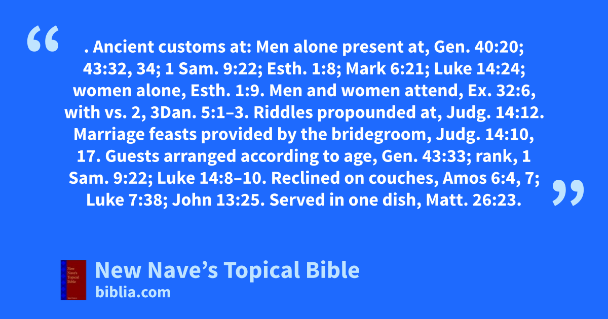 FEASTS. Ancient customs at: Men alone present at, Gen. 40:20; 43:32, 34; 1 Sam. 9:22; Esth. 1:8; Mark 6:21; Luke 14:24; women alone, Esth. 1:9. Men and women attend, Ex. 32:6, with vs. 2, 3Dan. 5:1–3. Riddles propounded at, Judg. 14:12. Marriage feasts provided by the bridegroom, Judg. 14:10, 17. Guests arranged according to age, Gen. 43:33; rank, 1 Sam. 9:22; Luke 14:8–10. Reclined on couches, Amos 6:4, 7; Luke 7:38; John 13:25. Served in one dish, Matt. 26:23. Were presided over by a governor, John 2:8, 9. Host served, Gen. 18:8. Wine served at, Esth. 5:6; 7:7. Music at, Isa. 5:12; Amos 6:4, 5; Luke 15:25. Dancing at, Matt. 14:6; Luke 15:25. Given by kings, 1 Sam. 20:5; 25:36; 2 Sam. 9:10; 1 Kin. 2:7; 4:22; 18:19; Esth. 1:3–8; Dan. 5:1–4. Drunkenness at, 1 Sam. 25:36; Esth. 1:10; Dan. 5:1–4. Covenants ratified by, Gen. 26:28–30. Celebrations by: Birthdays, Gen. 40:20; Mark 6:21; coronations, 1 Kin. 1:25; 1 Chr. 12:38–40; national deliverances, Esth. 8:17; 9:17–19.