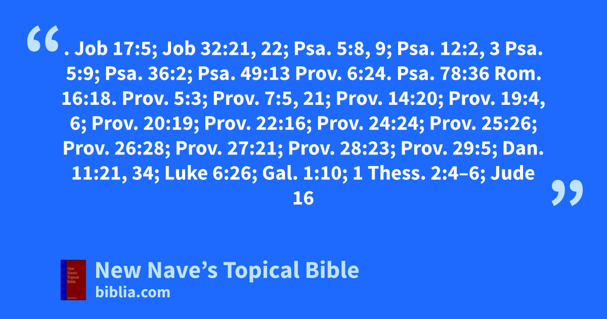 FLATTERY. Job 17:5; Job 32:21, 22; Psa. 5:8, 9; Psa. 12:2, 3 Psa. 5:9; Psa. 36:2; Psa. 49:13 Prov. 6:24. Psa. 78:36 Rom. 16:18. Prov. 5:3; Prov. 7:5, 21; Prov. 14:20; Prov. 19:4, 6; Prov. 20:19; Prov. 22:16; Prov. 24:24; Prov. 25:26; Prov. 26:28; Prov. 27:21; Prov. 28:23; Prov. 29:5; Dan. 11:21, 34; Luke 6:26; Gal. 1:10; 1 Thess. 2:4–6; Jude 16