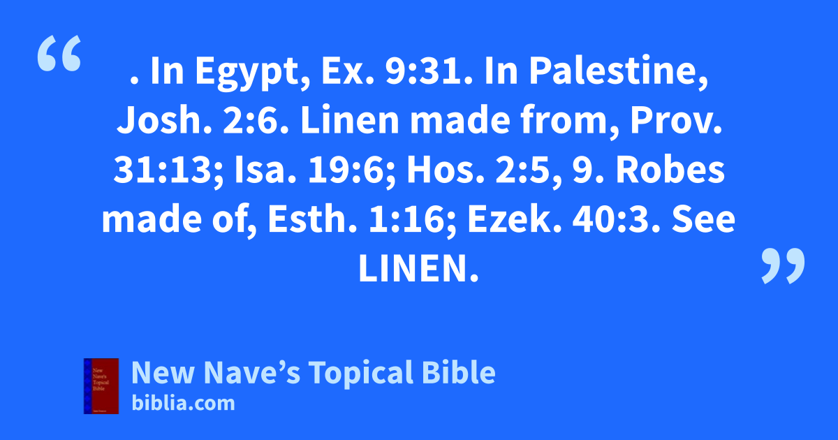 FLAX. In Egypt, Ex. 9:31. In Palestine, Josh. 2:6. Linen made from, Prov. 31:13; Isa. 19:6; Hos. 2:5, 9. Robes made of, Esth. 1:16; Ezek. 40:3. See Linen.