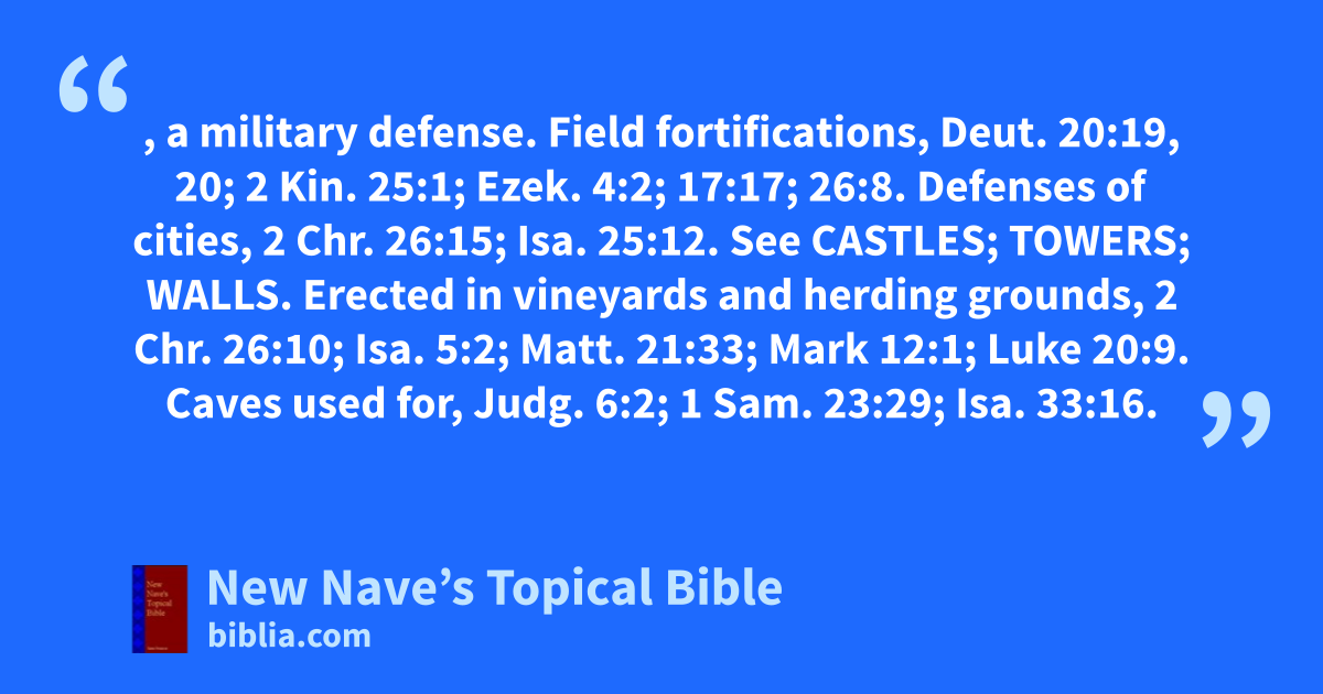 FORT, a military defense. Field fortifications, Deut. 20:19, 20; 2 Kin. 25:1; Ezek. 4:2; 17:17; 26:8. Defenses of cities, 2 Chr. 26:15; Isa. 25:12. See Castles; Towers; Walls. Erected in vineyards and herding grounds, 2 Chr. 26:10; Isa. 5:2; Matt. 21:33; Mark 12:1; Luke 20:9. Caves used for, Judg. 6:2; 1 Sam. 23:29; Isa. 33:16.