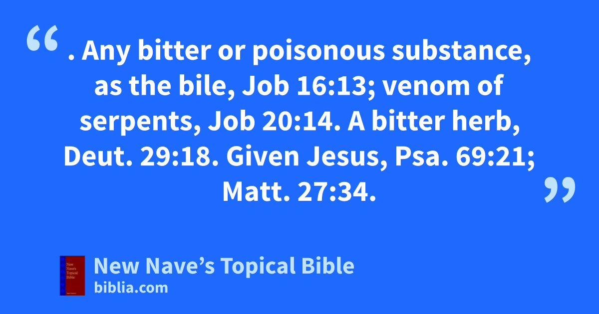 GALL. Any bitter or poisonous substance, as the bile, Job 16:13; venom of serpents, Job 20:14. A bitter herb, Deut. 29:18. Given Jesus, Psa. 69:21; Matt. 27:34.