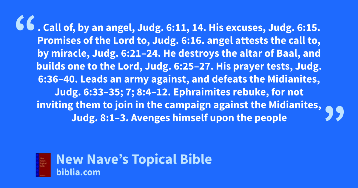 GIDEON. Call of, by an angel, Judg. 6:11, 14. His excuses, Judg. 6:15. Promises of the Lord to, Judg. 6:16. angel attests the call to, by miracle, Judg. 6:21–24. He destroys the altar of Baal, and builds one to the Lord, Judg. 6:25–27. His prayer tests, Judg. 6:36–40. Leads an army against, and defeats the Midianites, Judg. 6:33–35; 7; 8:4–12. Ephraimites rebuke, for not inviting them to join in the campaign against the Midianites, Judg. 8:1–3. Avenges himself upon the people of Succoth, Judg. 8:14–17. Israel desires to make him king, he refuses, Judg. 8:22, 23. Makes an ephod which becomes a snare to the Israelites, Judg. 8:24–27. Had seventy sons, Judg. 8:30. Death of, Judg. 8:32. Faith of, Heb. 11:32.