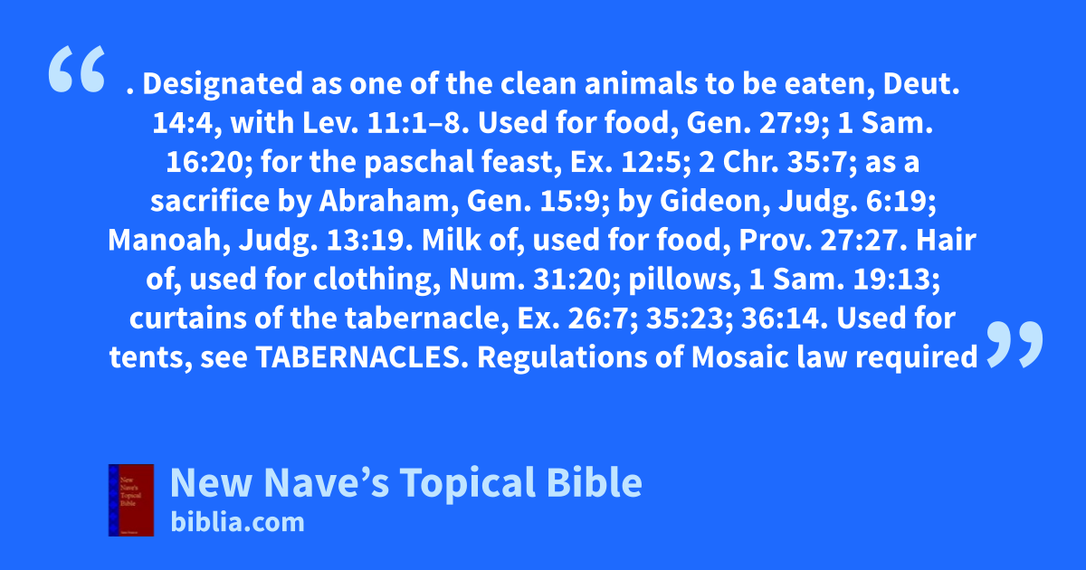 GOAT. Designated as one of the clean animals to be eaten, Deut. 14:4, with Lev. 11:1–8. Used for food, Gen. 27:9; 1 Sam. 16:20; for the paschal feast, Ex. 12:5; 2 Chr. 35:7; as a sacrifice by Abraham, Gen. 15:9; by Gideon, Judg. 6:19; Manoah, Judg. 13:19. Milk of, used for food, Prov. 27:27. Hair of, used for clothing, Num. 31:20; pillows, 1 Sam. 19:13; curtains of the tabernacle, Ex. 26:7; 35:23; 36:14. Used for tents, see Tabernacles. Regulations of Mosaic law required that a kid should not be killed for food before it was eight days old, Lev. 22:27, nor boiled in its mother’s milk, Ex. 23:19. Numerous, Deut. 32:14; Song 4:1; 6:5; 1 Sam. 25:2; 2 Chr. 17:11. Wild, in Palestine, 1 Sam. 24:2; Psa. 104:18.