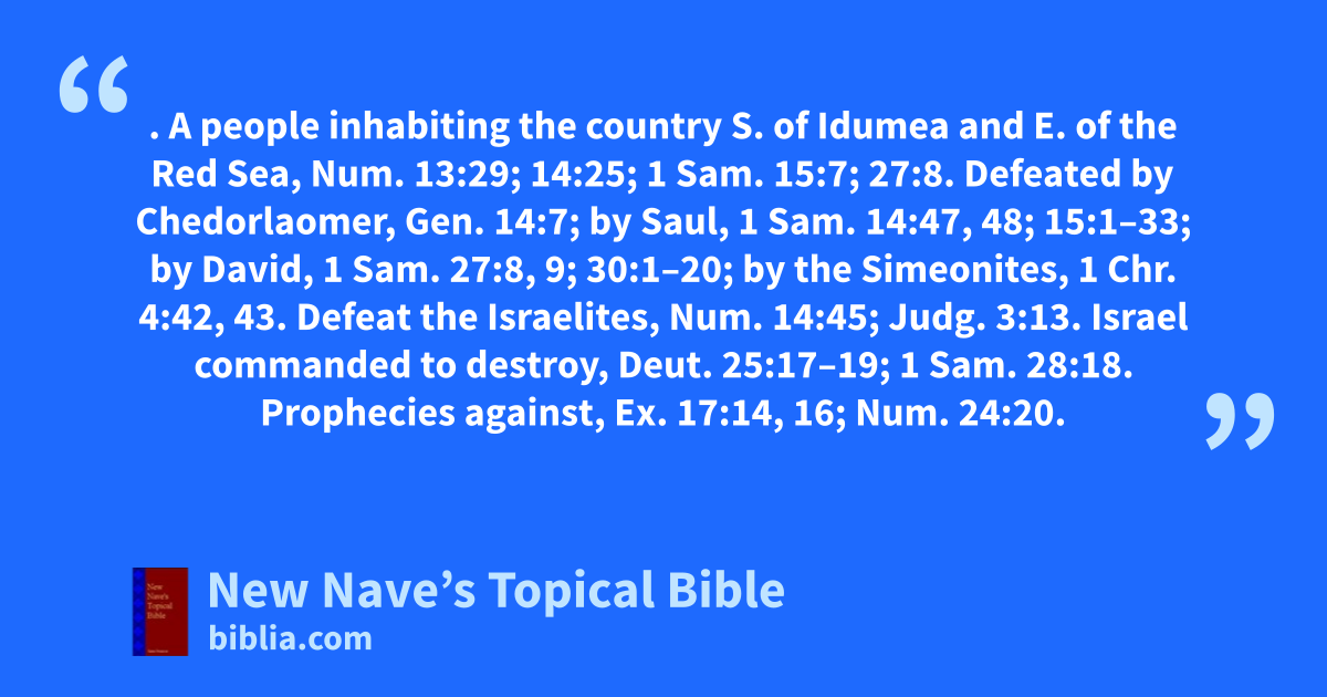 AMALEKITES. A people inhabiting the country S. of Idumea and E. of the Red Sea, Num. 13:29; 14:25; 1 Sam. 15:7; 27:8. Defeated by Chedorlaomer, Gen. 14:7; by Saul, 1 Sam. 14:47, 48; 15:1–33; by David, 1 Sam. 27:8, 9; 30:1–20; by the Simeonites, 1 Chr. 4:42, 43. Defeat the Israelites, Num. 14:45; Judg. 3:13. Israel commanded to destroy, Deut. 25:17–19; 1 Sam. 28:18. Prophecies against, Ex. 17:14, 16; Num. 24:20.