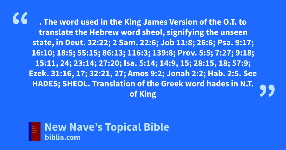 HELL. The word used in the King James Version of the O.T. to translate the Hebrew word sheol, signifying the unseen state, in Deut. 32:22; 2 Sam. 22:6; Job 11:8; 26:6; Psa. 9:17; 16:10; 18:5; 55:15; 86:13; 116:3; 139:8; Prov. 5:5; 7:27; 9:18; 15:11, 24; 23:14; 27:20; Isa. 5:14; 14:9, 15; 28:15, 18; 57:9; Ezek. 31:16, 17; 32:21, 27; Amos 9:2; Jonah 2:2; Hab. 2:5. See Hades; Sheol. Translation of the Greek word hades in N.T. of King James Version, the unseen world, Matt. 11:23; 16:18; Luke 10:15; 16:23; Acts 2:27, 31; Rev. 1:18; 6:8; 20:13, 14; of the Greek word gehenna, signifying the place of torment, Matt. 5:22, 29, 30; 10:28; 18:9; 23:15, 33; Mark 9:43, 45, 47; Luke 12:5; Jas. 3:6; of the Greek verb tartaro¢, signifying the infernal region, 2 Pet. 2:4. Sheol is also translated “grave” in King James Version in Gen. 37:35; 42:38; 44:29, 31; 1 Sam. 2:6; 1 Kin. 2:6, 9; Job 7:9; 14:13; 17:13; 21:13; 24:19; Psa. 6:5; 30:3; 31:17; 49:14, 15; 88:3; 89:48; 141:7; Prov. 1:12; 30:16; Eccl. 9:10; Song 8:6; Isa. 14:11; 38:10, 18; Ezek. 31:15; Hos. 13:14; pit, Num. 16:30, 33; Job 17:16. The English revisers insert the Hebrew word sheol in places where hell, grave, and pit were used in the A.V. as translations of the word sheol, except in Deut. 32:22; Psa. 55:15; 86:13; and in the prophetical books. The American revisers invariably use Sheol in the American text, where it occurs in the original.