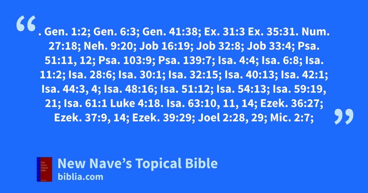 HOLY SPIRIT. Gen. 1:2; Gen. 6:3; Gen. 41:38; Ex. 31:3 Ex. 35:31. Num. 27:18; Neh. 9:20; Job 16:19; Job 32:8; Job 33:4; Psa. 51:11, 12; Psa. 103:9; Psa. 139:7; Isa. 4:4; Isa. 6:8; Isa. 11:2; Isa. 28:6; Isa. 30:1; Isa. 32:15; Isa. 40:13; Isa. 42:1; Isa. 44:3, 4; Isa. 48:16; Isa. 51:12; Isa. 54:13; Isa. 59:19, 21; Isa. 61:1 Luke 4:18. Isa. 63:10, 11, 14; Ezek. 36:27; Ezek. 37:9, 14; Ezek. 39:29; Joel 2:28, 29; Mic. 2:7; Mic. 3:8; Hag. 2:5; Zech. 4:6 vs. 1–7.; Zech. 12:10; Matt. 1:18 v. 20.; Matt. 3:11 [John 1:33; Acts 11:16.] Matt. 3:16, 17 Mark 1:10; Luke 3:22; John 1:32. Matt. 4:1; Matt. 10:20 Mark 13:11. Matt. 12:28; Matt. 28:19; Mark 12:36; Mark 13:11; Luke 1:15, 35, 67; Luke 2:25–27; Luke 11:13; Luke 12:12; Luke 24:49; John 1:9; John 3:5, 6, 34; John 4:14; John 6:45, 63; John 7:38, 39; John 14:16, 17, 26; John 15:26; John 16:7–14; John 20:22; Acts 1:2, 5, 8, 16; Acts 2:2–4, 33, 38; Acts 4:8, 31; Acts 5:3, 4, 9, 32; Acts 6:5; Acts 7:51; Acts 8:15–19; Acts 9:31; Acts 10:19, 20, 44–47 Acts 11:17. Acts 11:15, 16, 24; Acts 13:2, 4, 9, 52; Acts 15:8, 28; Acts 16:6, 7; Acts 19:2–6; Acts 20:28; Rom. 1:4; Rom. 5:5 vs. 3–5.; Rom. 8:1, 2, 4, 9, 11, 13–16, 23, 26, 27 vs. 1–27.; Rom. 9:1; Rom. 14:17; Rom. 15:13, 16, 18, 19, 30; 1 Cor. 2:4, 10 [Rom. 11:33, 34.] 1 Cor. 2:11–14; 1 Cor. 3:16 1 Cor. 6:19. 1 Cor. 6:11, 19; 1 Cor. 12:3–11; 2 Cor. 1:22 2 Cor. 5:5. 2 Cor. 3:3, 6, 17, 18; 2 Cor. 5:5; 2 Cor. 6:4, 6; 2 Cor. 13:14; Gal. 3:2, 3, 14; Gal. 4:6; Gal. 5:5, 16–18, 22, 23, 25; Gal. 6:8; Eph. 1:12–14, 17; Eph. 2:18, 22; Eph. 3:5, 16; Eph. 4:3, 4, 30; Eph. 5:9, 18; Eph. 6:17, 18; Phil. 1:19; Phil. 2:1; Col. 1:8; 1 Thess. 1:5, 6; 1 Thess. 4:8, 9; 1 Thess. 5:19; 2 Thess. 2:13; 1 Tim. 4:1; 2 Tim. 1:7, 14; Tit. 3:5, 6; Heb. 2:4; Heb. 3:7; Heb. 6:4; Heb. 9:14; Heb. 10:15, 29; 1 Pet. 1:2, 11, 12, 22; 1 Pet. 3:18; 1 Pet. 4:14; 2 Pet. 1:21; 1 John 2:20; 1 John 3:24; 1 John 4:2, 13; 1 John 5:6–8; Jude 19, 20; Rev. 1:4 Rev. 4:5; 5:6. Rev. 2:7 vs. 11, 29.; Rev. 11:11; Rev. 14:13; Rev. 19:10; Rev. 22:17 See God, A Spirit; Inspiration; Word of God, Inspiration of.