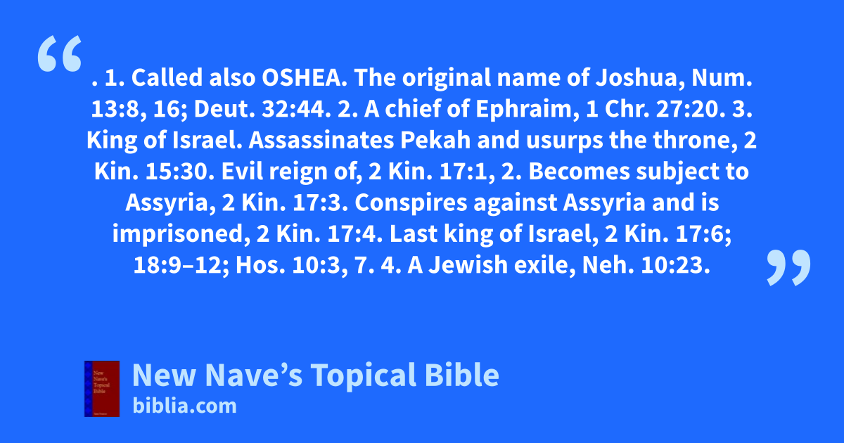 HOSHEA. 1. Called also Oshea. The original name of Joshua, Num. 13:8, 16; Deut. 32:44. 2. A chief of Ephraim, 1 Chr. 27:20. 3. King of Israel. Assassinates Pekah and usurps the throne, 2 Kin. 15:30. Evil reign of, 2 Kin. 17:1, 2. Becomes subject to Assyria, 2 Kin. 17:3. Conspires against Assyria and is imprisoned, 2 Kin. 17:4. Last king of Israel, 2 Kin. 17:6; 18:9–12; Hos. 10:3, 7. 4. A Jewish exile, Neh. 10:23.