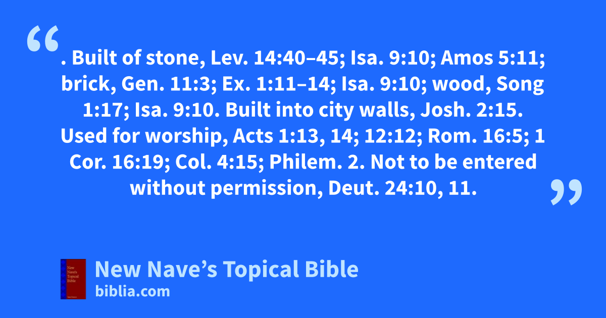 HOUSE. Built of stone, Lev. 14:40–45; Isa. 9:10; Amos 5:11; brick, Gen. 11:3; Ex. 1:11–14; Isa. 9:10; wood, Song 1:17; Isa. 9:10. Built into city walls, Josh. 2:15. Used for worship, Acts 1:13, 14; 12:12; Rom. 16:5; 1 Cor. 16:19; Col. 4:15; Philem. 2. Not to be entered without permission, Deut. 24:10, 11.