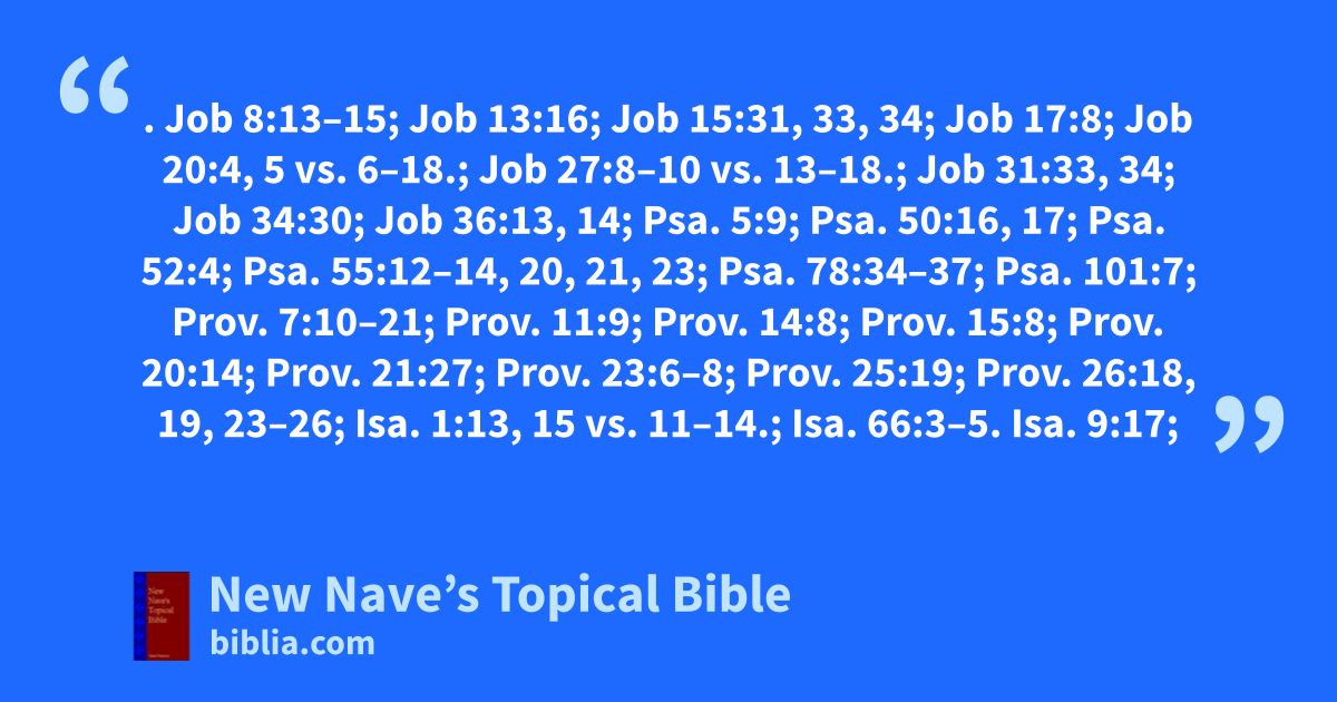 HYPOCRISY. Job 8:13–15; Job 13:16; Job 15:31, 33, 34; Job 17:8; Job 20:4, 5 vs. 6–18.; Job 27:8–10 vs. 13–18.; Job 31:33, 34; Job 34:30; Job 36:13, 14; Psa. 5:9; Psa. 50:16, 17; Psa. 52:4; Psa. 55:12–14, 20, 21, 23; Psa. 78:34–37; Psa. 101:7; Prov. 7:10–21; Prov. 11:9; Prov. 14:8; Prov. 15:8; Prov. 20:14; Prov. 21:27; Prov. 23:6–8; Prov. 25:19; Prov. 26:18, 19, 23–26; Isa. 1:13, 15 vs. 11–14.; Isa. 66:3–5. Isa. 9:17; Isa. 10:6; Isa. 29:13 [Matt. 15:8.] Isa. 29:15, 16; Isa. 32:5, 6; Isa. 33:14; Isa. 48:1, 2; Isa. 58:2–5; Isa. 61:8; Isa. 65:5; Jer. 3:10 v. 11.; Jer. 5:2; Jer. 6:20; Jer. 7:4, 8–10; Jer. 9:4, 8; Jer. 12:2; Jer. 17:9; Jer. 42:20 vs. 21, 22.; Lam. 1:2; Ezek. 14:7, 8 v. 4.; Ezek. 20:39 Ezek. 5:11; Hos. 8:13; 9:4. Ezek. 33:30–32; Hos. 6:4; Hos. 7:14, 16; Hos. 8:2, 3; Hos. 10:1, 4; Hos. 11:12; Amos 5:21, 23, 24 vs. 22, 25–27.; Obad. 7; Mic. 3:11; Mic. 7:5; Zech. 7:5, 6; Zech. 13:6; Mal. 1:6–8, 13, 14 vs. 9–12.; Mal. 2:13; Mal. 3:14; Matt. 3:7, 8; Matt. 6:1, 2, 5, 16, 24; Matt. 7:5, 15, 21–23 Luke 13:26, 27. Matt. 9:13; Matt. 15:7, 8 [Mark 7:6.] Matt. 15:9; Matt. 16:3 Luke 12:54–56. Matt. 21:28–32; Matt. 22:12, 13, 18; Matt. 23:2–33; Matt. 24:50, 51; Matt. 25:3, 41–45; Mark 7:7, 8 Matt. 15:7–9. Mark 12:38–40; Luke 6:46; Luke 8:18; Luke 11:39, 42, 44, 52 vs. 39–52.; Luke 12:1, 2 Matt. 16:6, 12; Mark 8:15. Luke 13:13–17; Luke 14:34 v. 35; Mark 9:50. Luke 16:13, 15; Luke 18:11, 12; Luke 20:46, 47 Matt. 23:14; Mark 12:38–40. Luke 21:16; John 6:26, 70; John 7:19; John 15:2, 6; Rom. 1:18; Rom. 2:1, 3, 17–29; Rom. 9:6, 7; Rom. 16:18; 1 Cor. 13:1; 2 Cor. 4:2; 2 Cor. 5:12; Gal. 6:3; Phil. 3:2, 18, 19; 1 Tim. 4:2; 2 Tim. 3:5, 13; Tit. 1:16; Jas. 1:8 [Jas. 4:8.] Jas. 1:22–24, 26; Jas. 2:14–26; Jas. 3:17; 1 Pet. 2:1, 16; 2 Pet. 2:1–3, 17, 19; 1 John 1:6, 10; 1 John 2:4, 9, 19; 1 John 4:20; Jude 12, 13; Rev. 2:9 Rev. 3:9. Rev. 3:1 See Deceit; Deception.
