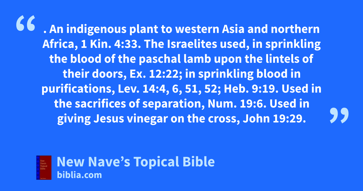 HYSSOP. An indigenous plant to western Asia and northern Africa, 1 Kin. 4:33. The Israelites used, in sprinkling the blood of the paschal lamb upon the lintels of their doors, Ex. 12:22; in sprinkling blood in purifications, Lev. 14:4, 6, 51, 52; Heb. 9:19. Used in the sacrifices of separation, Num. 19:6. Used in giving Jesus vinegar on the cross, John 19:29.