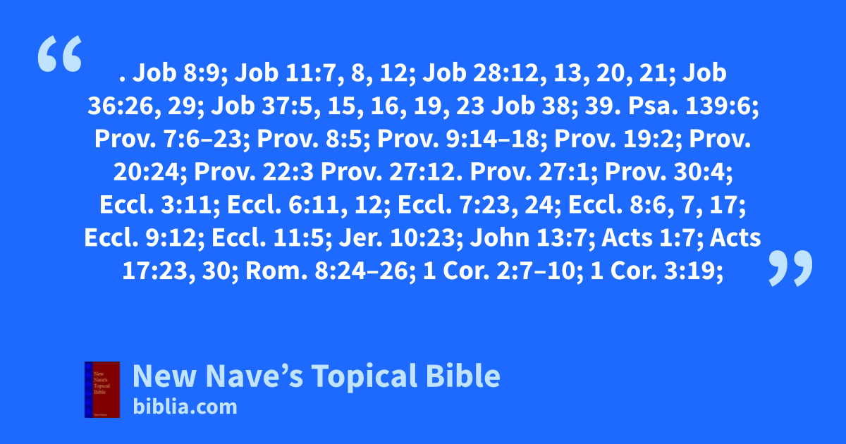 IGNORANCE. Job 8:9; Job 11:7, 8, 12; Job 28:12, 13, 20, 21; Job 36:26, 29; Job 37:5, 15, 16, 19, 23 Job 38; 39. Psa. 139:6; Prov. 7:6–23; Prov. 8:5; Prov. 9:14–18; Prov. 19:2; Prov. 20:24; Prov. 22:3 Prov. 27:12. Prov. 27:1; Prov. 30:4; Eccl. 3:11; Eccl. 6:11, 12; Eccl. 7:23, 24; Eccl. 8:6, 7, 17; Eccl. 9:12; Eccl. 11:5; Jer. 10:23; John 13:7; Acts 1:7; Acts 17:23, 30; Rom. 8:24–26; 1 Cor. 2:7–10; 1 Cor. 3:19; 1 Cor. 13:9, 12; Jas. 1:5, 6 See Knowledge; Wisdom.