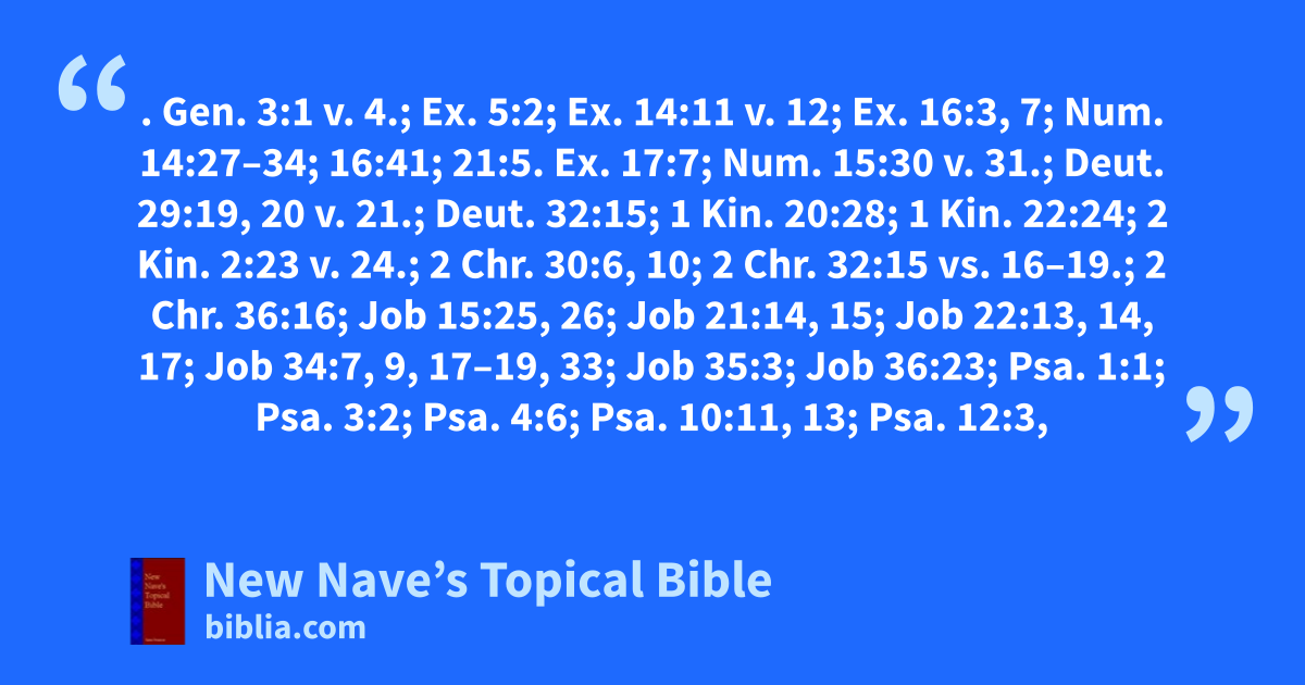 INFIDELITY. Gen. 3:1 v. 4.; Ex. 5:2; Ex. 14:11 v. 12; Ex. 16:3, 7; Num. 14:27–34; 16:41; 21:5. Ex. 17:7; Num. 15:30 v. 31.; Deut. 29:19, 20 v. 21.; Deut. 32:15; 1 Kin. 20:28; 1 Kin. 22:24; 2 Kin. 2:23 v. 24.; 2 Chr. 30:6, 10; 2 Chr. 32:15 vs. 16–19.; 2 Chr. 36:16; Job 15:25, 26; Job 21:14, 15; Job 22:13, 14, 17; Job 34:7, 9, 17–19, 33; Job 35:3; Job 36:23; Psa. 1:1; Psa. 3:2; Psa. 4:6; Psa. 10:11, 13; Psa. 12:3, 4; Psa. 14:1, 6 Psa. 53:1. Psa. 42:3; Psa. 50:21; Psa. 59:7; Psa. 64:5; Psa. 73:11; Psa. 78:19 vs. 20–22.; Psa. 107:11, 12. Psa. 94:7–9; Psa. 106:24, 25; Prov. 1:22; Prov. 3:34; Prov. 9:12; Prov. 14:6, 9; Prov. 19:29; Prov. 24:9; Isa. 3:8; Isa. 5:18, 19, 24, 25; Isa. 10:15; Isa. 28:9, 10, 14, 15, 17–22; Isa. 29:15, 16, 20; Isa. 45:9, 10; Isa. 47:10, 11; Isa. 57:4, 11 vs. 5–10.; Jer. 2:31; Jer. 5:12, 14; Jer. 17:15 Jer. 43:2. Jer. 48:42 v. 26.; Jer. 50:24, 29; Lam. 1:7; Ezek. 9:9, 10 Ezek. 8:12. Ezek. 12:22 Ezek. 11:3. Ezek. 18:2, 29 Ezek. 33:17. Ezek. 20:49; Ezek. 33:20, 30; Ezek. 36:2; Dan. 3:15; Dan. 8:25 v. 10.; Dan. 7:25; 11:36, 37. Hos. 7:5, 13, 15; Amos 5:18; Amos 7:16, 17; Mic. 7:10; Zeph. 1:12; Mal. 1:7; Mal. 3:13, 14; Matt. 12:24 Mark 3:22; Luke 11:15; 16:14. Matt. 25:24–27; Matt. 27:39–44; Luke 4:23; Luke 19:14, 27; Acts 2:13; Acts 13:45; Acts 17:18, 32; Acts 23:8 Matt. 22:23. Rom. 9:20, 21 Rom. 3:5. Heb. 10:29; 2 Pet. 2:1; 2 Pet. 3:3, 4 v. 5.; Jude 4, 15, 18 v. 19. See Presumption; Skepticism; Unbelief.