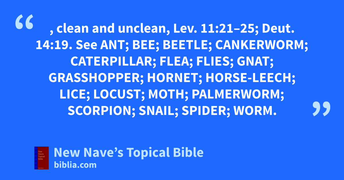 INSECTS, clean and unclean, Lev. 11:21–25; Deut. 14:19. See Ant; Bee; Beetle; Cankerworm; Caterpillar; Flea; Flies; Gnat; Grasshopper; Hornet; Horse-leech; Lice; Locust; Moth; Palmerworm; Scorpion; Snail; Spider; Worm.