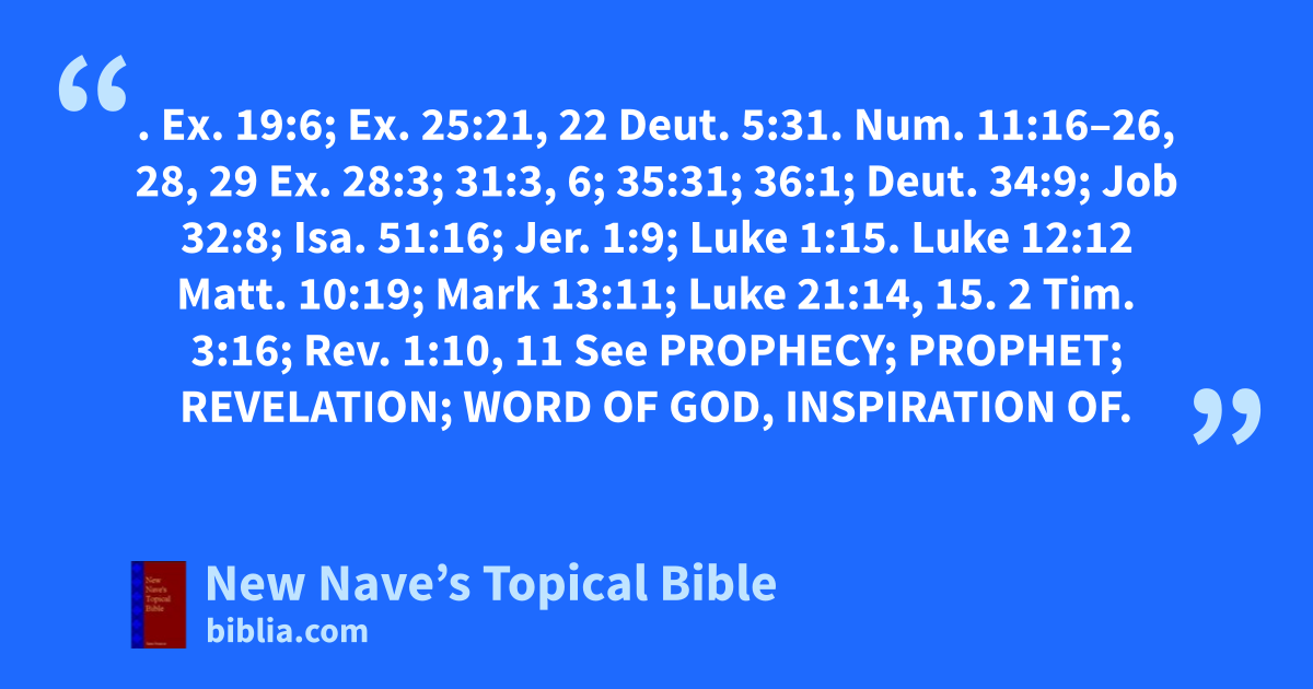 INSPIRATION. Ex. 19:6; Ex. 25:21, 22 Deut. 5:31. Num. 11:16–26, 28, 29 Ex. 28:3; 31:3, 6; 35:31; 36:1; Deut. 34:9; Job 32:8; Isa. 51:16; Jer. 1:9; Luke 1:15. Luke 12:12 Matt. 10:19; Mark 13:11; Luke 21:14, 15. 2 Tim. 3:16; Rev. 1:10, 11 See Prophecy; Prophet; Revelation; Word of God, Inspiration of.