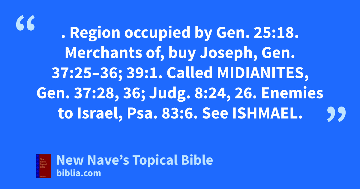 ISHMAELITES. Region occupied by Gen. 25:18. Merchants of, buy Joseph, Gen. 37:25–36; 39:1. Called Midianites, Gen. 37:28, 36; Judg. 8:24, 26. Enemies to Israel, Psa. 83:6. See Ishmael.