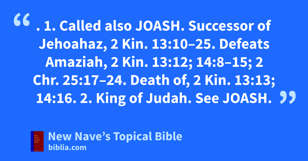 JEHOASH. 1. Called also Joash. Successor of Jehoahaz, 2 Kin. 13:10–25. Defeats Amaziah, 2 Kin. 13:12; 14:8–15; 2 Chr. 25:17–24. Death of, 2 Kin. 13:13; 14:16. 2. King of Judah. See Joash.