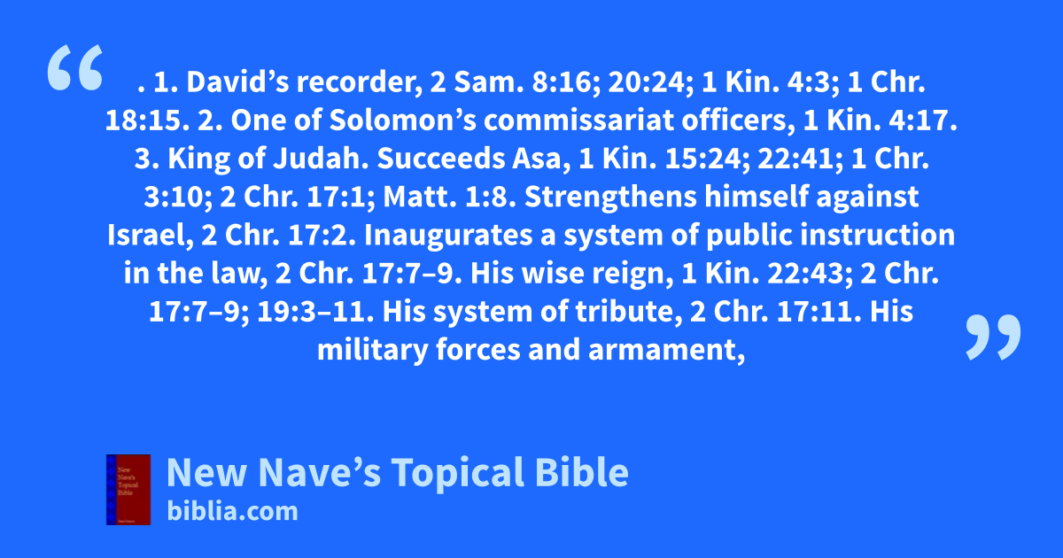 JEHOSHAPHAT. 1. David’s recorder, 2 Sam. 8:16; 20:24; 1 Kin. 4:3; 1 Chr. 18:15. 2. One of Solomon’s commissariat officers, 1 Kin. 4:17. 3. King of Judah. Succeeds Asa, 1 Kin. 15:24; 22:41; 1 Chr. 3:10; 2 Chr. 17:1; Matt. 1:8. Strengthens himself against Israel, 2 Chr. 17:2. Inaugurates a system of public instruction in the law, 2 Chr. 17:7–9. His wise reign, 1 Kin. 22:43; 2 Chr. 17:7–9; 19:3–11. His system of tribute, 2 Chr. 17:11. His military forces and armament, 2 Chr. 17:12–19. Joins Ahab in an invasion of Ramoth-gilead, 1 Kin. 22; 2 Chr. 18. Rebuked by the prophet Jehu, 2 Chr. 19:2. The allied forces of the Amorites, Moabites, and other tribes invade his territory, and are defeated by, 2 Chr. 20. Builds ships for commerce with Tarshish, ships are destroyed, 1 Kin. 22:48, 49; 2 Chr. 20:35–37. Joins Jehoram, king of Israel, in an invasion of the land of Moab, defeats the Moabites, 2 Kin. 3. Makes valuable gifts to the temple, 2 Kin. 12:18. Death of, 1 Kin. 22:50; 2 Chr. 21:1. Religious zeal of, 1 Kin. 22:43, 46; 2 Chr. 17:1–9; 19; 20:1–32; 22:9. Prosperity of, 1 Kin. 22:45, 48; 2 Chr. 17–20. legacy of, to his children, 2 Chr. 21:2, 3. 4. Father of Jehu, 2 Kin. 9:2, 14. 5. A priest who assisted in bringing the ark from Obed-edom, 1 Chr. 15:24. 6. A valley. Called Valley of Decision, Joel 3:2, 12, 14.