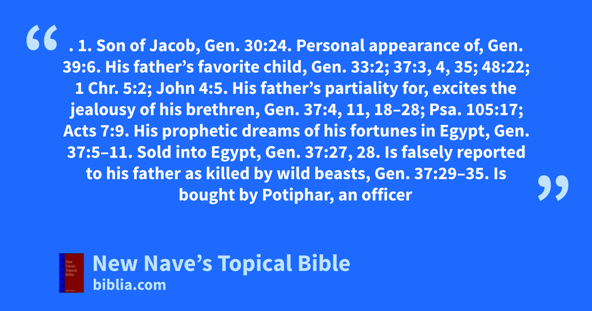 JOSEPH. 1. Son of Jacob, Gen. 30:24. Personal appearance of, Gen. 39:6. His father’s favorite child, Gen. 33:2; 37:3, 4, 35; 48:22; 1 Chr. 5:2; John 4:5. His father’s partiality for, excites the jealousy of his brethren, Gen. 37:4, 11, 18–28; Psa. 105:17; Acts 7:9. His prophetic dreams of his fortunes in Egypt, Gen. 37:5–11. Sold into Egypt, Gen. 37:27, 28. Is falsely reported to his father as killed by wild beasts, Gen. 37:29–35. Is bought by Potiphar, an officer of Pharaoh, Gen. 37:36. Is prospered of God, Gen. 39:2–5, 21, 23. Is falsely accused, and cast into prison; is delivered by the friendship of another prisoner, Gen. 39; 40; Psa. 105:18. Is an interpreter of dreams: of the two prisoners, Gen. 40:5–23; of Pharaoh, Gen. 41:1–37. His name is changed to Zaphnath-paaneah, Gen. 41:45. Is promoted to authority next to Pharaoh at thirty years of age, Gen. 41:37–46; Psa. 105:19–22. Takes to wife the daughter of the priest of On, Gen. 41:45. Provides against the years of famine, Gen. 41:46–57. Exports the produce of Egypt to other countries, Gen. 41:57. Sells the stores of food to the people of Egypt, exacting of them all their money, flocks and herds, lands and lives, Gen. 47:13–26. Exempts the priests from the exactions, Gen. 47:22, 26. His father sends down into Egypt to buy grain, Gen. 42–44. Reveals himself to his brethren; sends for his father; provides the land of Goshen for his people; and sustains them during the famine, Gen. 45; 46; 47:1–12. His two sons, Gen. 41:50, 52. See Ephraim; Manasseh. Mourns the death of his father, Gen. 50:1–14. Exacts a pledge from his brethren to convey his remains to Canaan, Gen. 50:24, 25; Heb. 11:22, with Ex. 13:19; Josh. 24:32; Acts 7:16. Death of, Gen. 50:22–26. Kindness of heart, Gen. 40:7, 8. His integrity, Gen. 39:7–12; humility, Gen. 41:16; 45:7–9; wisdom, Gen. 41:33–57; piety, Gen. 41:51, 52; faith, Gen. 45:5–8. Was a prophet, Gen. 41:38, 39; 50:25; Ex. 13:19. God’s providence with, Gen. 39:2–5; Psa. 105:17–22. His sons both blessed Joseph, Deut. 33:13–17. Descendants of, Gen. 46:20; Num. 26:28–37. 2. Father of Igal the spy, Num. 13:7. 3. Of the sons of Asaph, 1 Chr. 25:2, 9. 4. A returned exile, Ezra 10:42. 5. A priest, Neh. 12:14. 6. Husband of Mary, Matt. 13:55; Mark 6:3; Matt. 1:18–25; Luke 1:27. His genealogy, Matt. 1:1–16; Luke 3:23–38. An angel appears and testifies to the innocence of his betrothed, Matt. 1:19–24. Dwells at Nazareth, Luke 2:4. Belongs to the city of Bethlehem, Luke 2:4. Goes to Bethlehem to be enrolled, Luke 2:1–4. Jesus born to, Matt. 1:25; Luke 2:7. Presents Jesus in the temple, Luke 2:22–39. Returns to Nazareth, Luke 2:39. Warned in a dream to escape to Egypt in order to save the child’s life, Matt. 2:13–15. Warned in a dream to return to Nazareth, Matt. 2:19–23. Attends the annual feast at Jerusalem with his family, Luke 2:42–51. 7. Of Arimathea. Begs the body of Jesus for burial in his own tomb, Matt. 27:57–60; Mark 15:42–47; Luke 23:50–56; John 19:38–42. 8. Three ancestors of Joseph, Luke 3:24, 26, 30. 9. Called also Barsabas, surnamed Justus. One of the two persons nominated in place of Judas, Acts 1:21–23. 10. A designation of the ten tribes of Israel, Amos 5:6.