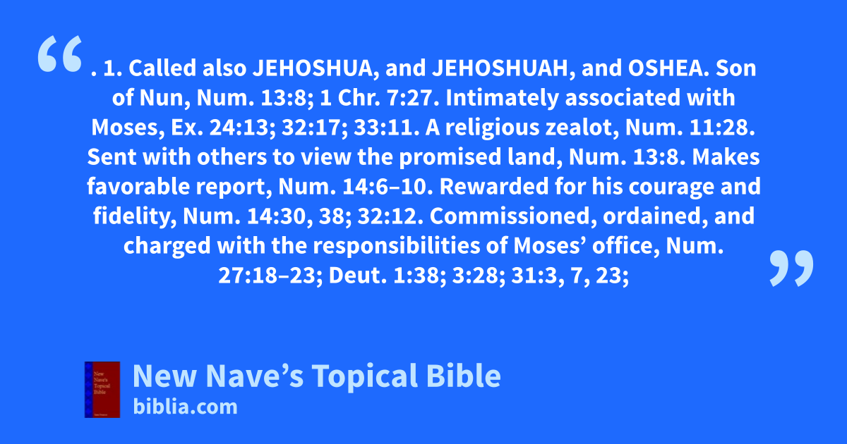 JOSHUA. 1. Called also Jehoshua, and Jehoshuah, and Oshea. Son of Nun, Num. 13:8; 1 Chr. 7:27. Intimately associated with Moses, Ex. 24:13; 32:17; 33:11. A religious zealot, Num. 11:28. Sent with others to view the promised land, Num. 13:8. Makes favorable report, Num. 14:6–10. Rewarded for his courage and fidelity, Num. 14:30, 38; 32:12. Commissioned, ordained, and charged with the responsibilities of Moses’ office, Num. 27:18–23; Deut. 1:38; 3:28; 31:3, 7, 23; 34:9. Divinely inspired, Num. 27:18; Deut. 34:9; Josh. 1:5, 9; 3:7; 8:8. His life miraculously preserved when he made a favorable report of the land, Num. 14:10. Promises to, Josh. 1:5–9. Leads the people into the land of Canaan, Josh. 1–4; Acts 7:45; Heb. 4:8. Renews circumcision of the children of Israel; reestablishes the passover; has a vision of the angel of God, Josh. 5. Besieges and takes Jericho, Josh. 6. Takes ai, Josh. 7; 8. Makes a league with the Gibeonites, Josh. 9:3–27. The kings of the six nations of the Canaanites confederate against him, Josh. 9:1, 2; make war upon the Gibeonites; are defeated and slain, Josh. 10. Defeats seven other kings, Josh. 10:28–43. Makes conquest of Hazor, Josh. 11. Completes the conquest of the whole land, Josh. 11:23. List of the kings whom Joshua killed, Josh. 12. Allots the land, Josh. 13–19. Sets the tabernacle up in Shiloh, Josh. 18:1. Sets apart cities of refuge, Josh. 20; forty-eight cities for the Levites, Josh. 21. Exhortation of, before his death, Josh. 23; 24. Survives the Israelites who refused to enter Canaan, Num. 26:63–65. His portion of the land, Josh. 19:49, 50. Death and burial of, Josh. 24:29, 30. Esteem in which he was held, Josh. 1:16–18. Faith of, Josh. 6:16. Military genius of, as exhibited at the defeat of the Amalekites, Ex. 17:13; at Ai, Josh. 8; in Gibeon, Josh. 10; at Hazor, Josh. 11. Age of, at death, Judg. 2:8. 2. An Israelite, 1 Sam. 6:14, 18. 3. A governor of Jerusalem, 2 Kin. 23:8. 4. Called also Jeshua. The high priest of the captivity, Ezra 2:2. Assists Zerubbabel in restoring the temple, Ezra 3; 4:1–6; 5; Hag. 1:1, 12–14; 2:2.