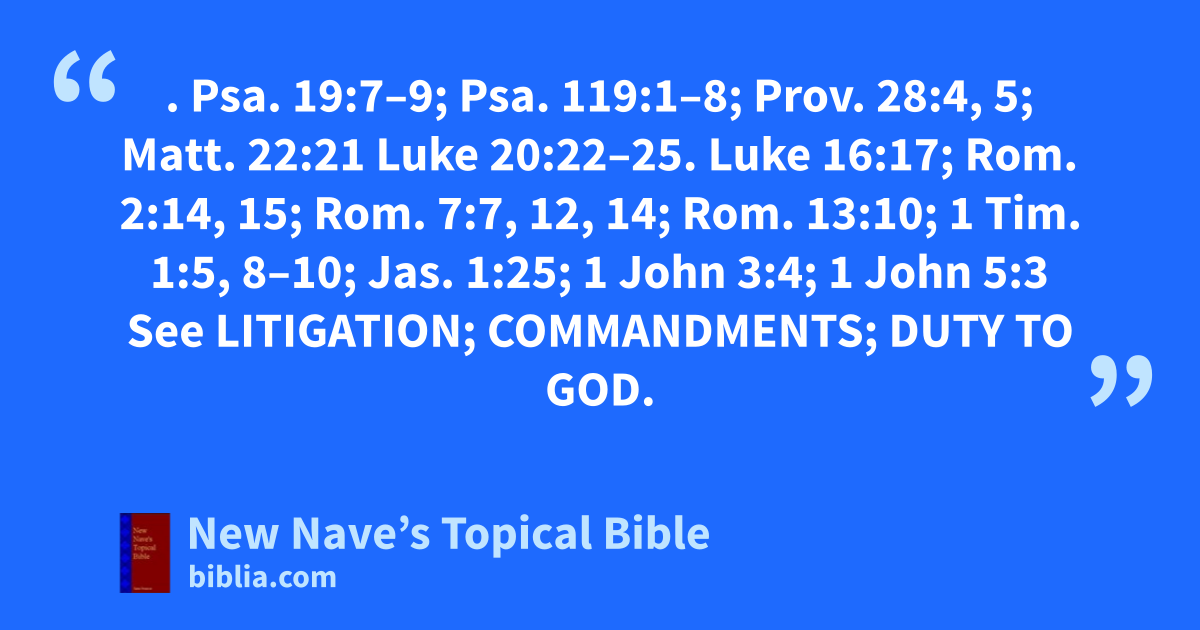LAW. Psa. 19:7–9; Psa. 119:1–8; Prov. 28:4, 5; Matt. 22:21 Luke 20:22–25. Luke 16:17; Rom. 2:14, 15; Rom. 7:7, 12, 14; Rom. 13:10; 1 Tim. 1:5, 8–10; Jas. 1:25; 1 John 3:4; 1 John 5:3 See Litigation; Commandments; Duty to God.