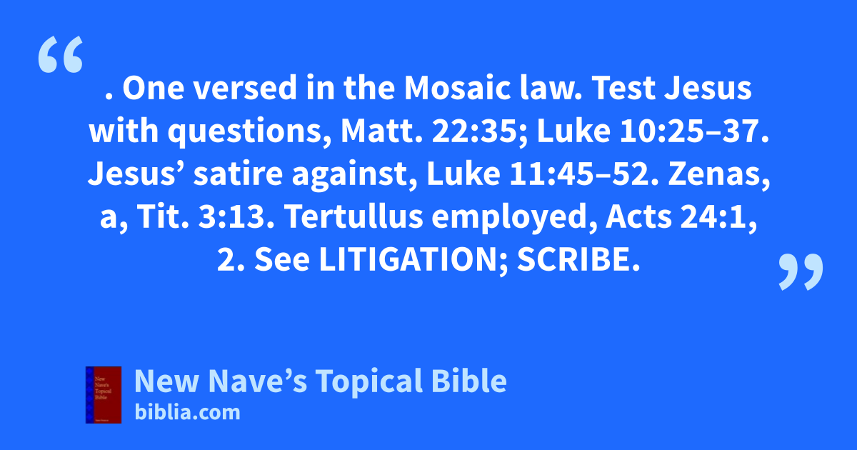 LAWYER. One versed in the Mosaic law. Test Jesus with questions, Matt. 22:35; Luke 10:25–37. Jesus’ satire against, Luke 11:45–52. Zenas, a, Tit. 3:13. Tertullus employed, Acts 24:1, 2. See Litigation; Scribe.