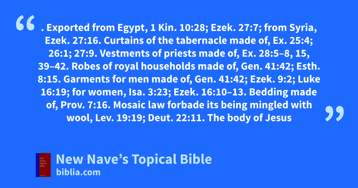LINEN. Exported from Egypt, 1 Kin. 10:28; Ezek. 27:7; from Syria, Ezek. 27:16. Curtains of the tabernacle made of, Ex. 25:4; 26:1; 27:9. Vestments of priests made of, Ex. 28:5–8, 15, 39–42. Robes of royal households made of, Gen. 41:42; Esth. 8:15. Garments for men made of, Gen. 41:42; Ezek. 9:2; Luke 16:19; for women, Isa. 3:23; Ezek. 16:10–13. Bedding made of, Prov. 7:16. Mosaic law forbade its being mingled with wool, Lev. 19:19; Deut. 22:11. The body of Jesus wrapped in, Mark 15:46; John 20:5.