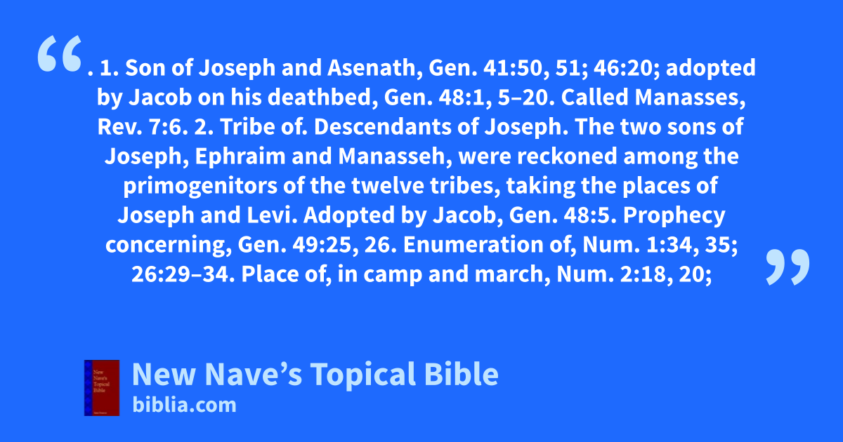 MANASSEH. 1. Son of Joseph and Asenath, Gen. 41:50, 51; 46:20; adopted by Jacob on his deathbed, Gen. 48:1, 5–20. Called Manasses, Rev. 7:6. 2. Tribe of. Descendants of Joseph. The two sons of Joseph, Ephraim and Manasseh, were reckoned among the primogenitors of the twelve tribes, taking the places of Joseph and Levi. Adopted by Jacob, Gen. 48:5. Prophecy concerning, Gen. 49:25, 26. Enumeration of, Num. 1:34, 35; 26:29–34. Place of, in camp and march, Num. 2:18, 20; 10:22, 23. Blessing of Moses on, Deut. 33:13–17. Inheritance of one-half of tribe east of Jordan, Num. 32:33, 39–42. One-half of tribe west of Jordan, Josh. 16:9; 17:5–11. The eastern half assist in the conquest of the country west of the Jordan, Deut. 3:18–20; Josh. 1:12–15; 4:12, 13. Join the other eastern tribes in erecting a monument to testify to the unity of all Israel; misunderstood; make satisfactory explanation, Josh. 22. Join Gideon in war with the Midianites, Judg. 6:7. Malcontents of, join David, 1 Chr. 12:19, 31. Killed by Hazael, 2 Kin. 10:33. Return from captivity, 1 Chr. 9:3. Reallotment of territory to, by Ezekiel, Ezek. 48:4. Affiliate with the Jews in the reign of Hezekiah, 2 Chr. 30. Incorporated into kingdom of Judah, 2 Chr. 15:9; 34:6, 7. See Israel, Tribes of. 3. Father of Gershom, Judg. 18:30. 4. King of Judah. History of, 2 Kin. 21:1–18; 2 Chr. 33:1–20. 5. Two Jews who put away their Gentile wives after the captivity, Ezra 10:30, 33.