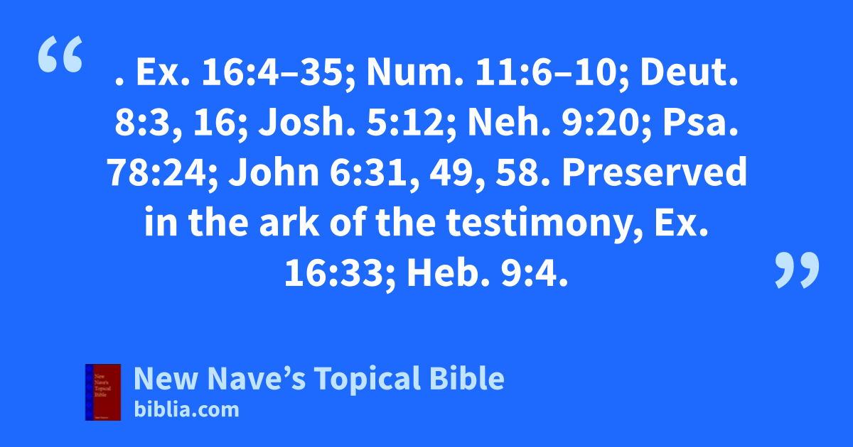 MANNA. Ex. 16:4–35; Num. 11:6–10; Deut. 8:3, 16; Josh. 5:12; Neh. 9:20; Psa. 78:24; John 6:31, 49, 58. Preserved in the ark of the testimony, Ex. 16:33; Heb. 9:4.