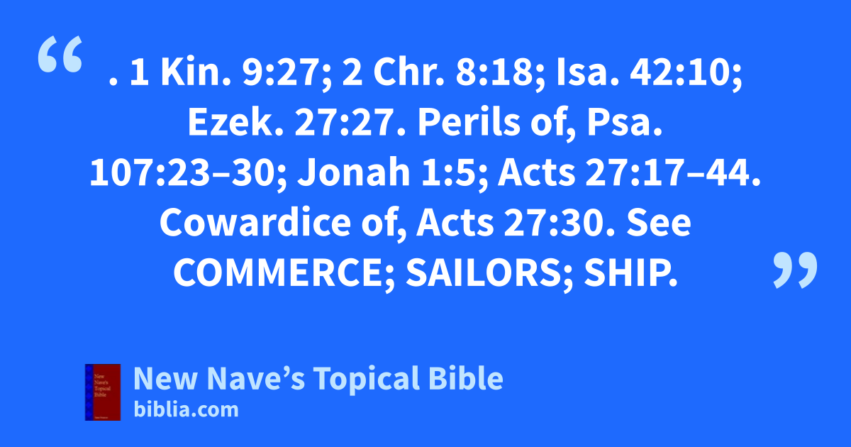 MARINER. 1 Kin. 9:27; 2 Chr. 8:18; Isa. 42:10; Ezek. 27:27. Perils of, Psa. 107:23–30; Jonah 1:5; Acts 27:17–44. Cowardice of, Acts 27:30. See Commerce; Sailors; Ship.