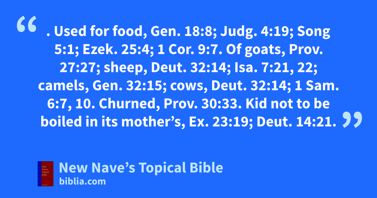 MILK. Used for food, Gen. 18:8; Judg. 4:19; Song 5:1; Ezek. 25:4; 1 Cor. 9:7. Of goats, Prov. 27:27; sheep, Deut. 32:14; Isa. 7:21, 22; camels, Gen. 32:15; cows, Deut. 32:14; 1 Sam. 6:7, 10. Churned, Prov. 30:33. Kid not to be boiled in its mother’s, Ex. 23:19; Deut. 14:21.