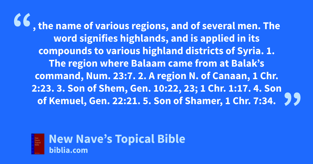 ARAM, the name of various regions, and of several men. The word signifies highlands, and is applied in its compounds to various highland districts of Syria. 1. The region where Balaam came from at Balak’s command, Num. 23:7. 2. A region N. of Canaan, 1 Chr. 2:23. 3. Son of Shem, Gen. 10:22, 23; 1 Chr. 1:17. 4. Son of Kemuel, Gen. 22:21. 5. Son of Shamer, 1 Chr. 7:34.