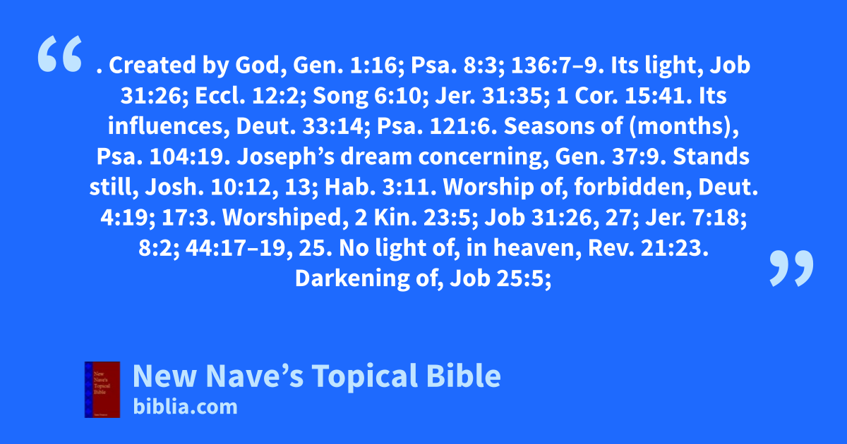 MOON. Created by God, Gen. 1:16; Psa. 8:3; 136:7–9. Its light, Job 31:26; Eccl. 12:2; Song 6:10; Jer. 31:35; 1 Cor. 15:41. Its influences, Deut. 33:14; Psa. 121:6. Seasons of (months), Psa. 104:19. Joseph’s dream concerning, Gen. 37:9. Stands still, Josh. 10:12, 13; Hab. 3:11. Worship of, forbidden, Deut. 4:19; 17:3. Worshiped, 2 Kin. 23:5; Job 31:26, 27; Jer. 7:18; 8:2; 44:17–19, 25. No light of, in heaven, Rev. 21:23. Darkening of, Job 25:5; Isa. 13:10; 24:23; Ezek. 32:7; Joel 2:10, 31; 3:15; Matt. 24:29; Mark 13:24; Luke 21:25; Acts 2:20; Rev. 6:12; 8:12.