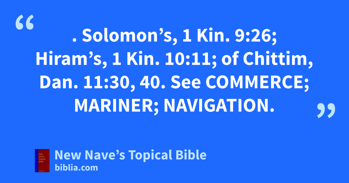NAVY. Solomon’s, 1 Kin. 9:26; Hiram’s, 1 Kin. 10:11; of Chittim, Dan. 11:30, 40. See Commerce; Mariner; Navigation.