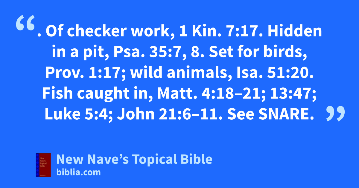 NET. Of checker work, 1 Kin. 7:17. Hidden in a pit, Psa. 35:7, 8. Set for birds, Prov. 1:17; wild animals, Isa. 51:20. Fish caught in, Matt. 4:18–21; 13:47; Luke 5:4; John 21:6–11. See Snare.