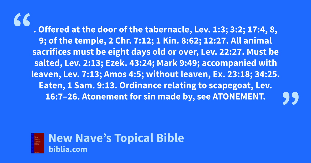 OFFERINGS. Offered at the door of the tabernacle, Lev. 1:3; 3:2; 17:4, 8, 9; of the temple, 2 Chr. 7:12; 1 Kin. 8:62; 12:27. All animal sacrifices must be eight days old or over, Lev. 22:27. Must be salted, Lev. 2:13; Ezek. 43:24; Mark 9:49; accompanied with leaven, Lev. 7:13; Amos 4:5; without leaven, Ex. 23:18; 34:25. Eaten, 1 Sam. 9:13. Ordinance relating to scapegoat, Lev. 16:7–26. Atonement for sin made by, see Atonement.