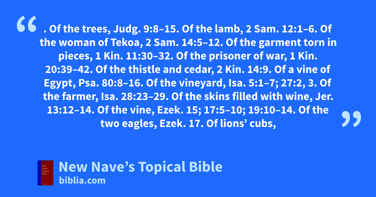 PARABLES. Of the trees, Judg. 9:8–15. Of the lamb, 2 Sam. 12:1–6. Of the woman of Tekoa, 2 Sam. 14:5–12. Of the garment torn in pieces, 1 Kin. 11:30–32. Of the prisoner of war, 1 Kin. 20:39–42. Of the thistle and cedar, 2 Kin. 14:9. Of a vine of Egypt, Psa. 80:8–16. Of the vineyard, Isa. 5:1–7; 27:2, 3. Of the farmer, Isa. 28:23–29. Of the skins filled with wine, Jer. 13:12–14. Of the vine, Ezek. 15; 17:5–10; 19:10–14. Of the two eagles, Ezek. 17. Of lions’ cubs, Ezek. 19:1–9. Of Aholah and Aholibah, Ezek. 23. The boiling pot, Ezek. 24:3–5. The gourd, Jonah 4:10, 11. The sheet let down from heaven in Peter’s vision, Acts 10:10–16. The two covenants, Gal. 4:22–31. The mercenary soldier, 2 Tim. 2:3, 4. Farmer, 2 Tim. 2:6. Furnished house, 2 Tim. 2:20, 21. The athlete, 2 Tim. 2:5. Looking-glass, Jas. 1:23–25. See Jesus, Parables of; Similitude; Symbols; Types.