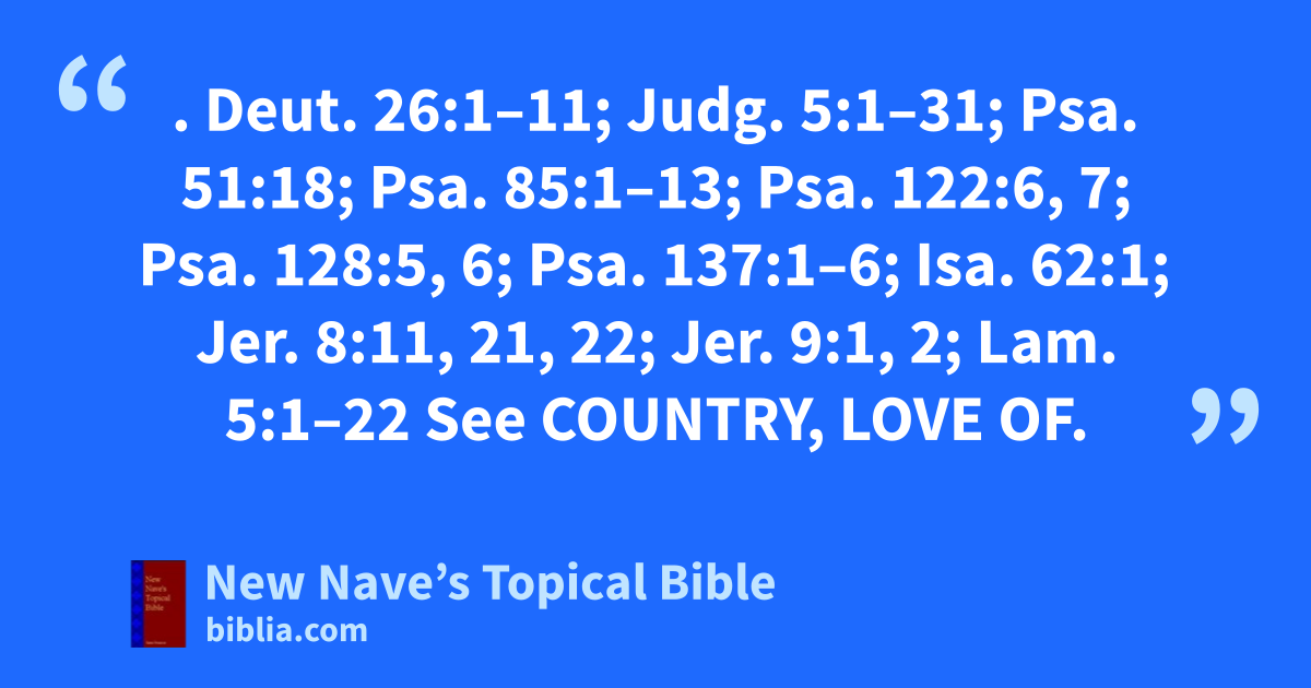 PATRIOTISM. Deut. 26:1–11; Judg. 5:1–31; Psa. 51:18; Psa. 85:1–13; Psa. 122:6, 7; Psa. 128:5, 6; Psa. 137:1–6; Isa. 62:1; Jer. 8:11, 21, 22; Jer. 9:1, 2; Lam. 5:1–22 See Country, Love of.