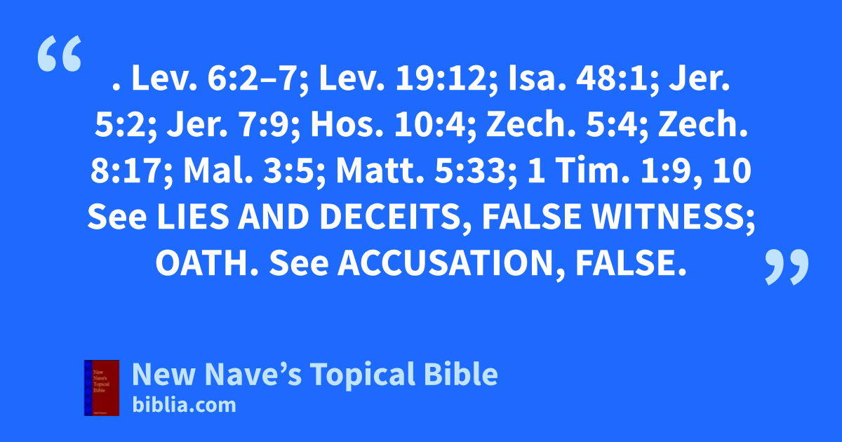 PERJURY. Lev. 6:2–7; Lev. 19:12; Isa. 48:1; Jer. 5:2; Jer. 7:9; Hos. 10:4; Zech. 5:4; Zech. 8:17; Mal. 3:5; Matt. 5:33; 1 Tim. 1:9, 10 See Lies and Deceits, False Witness; Oath. See Accusation, False.