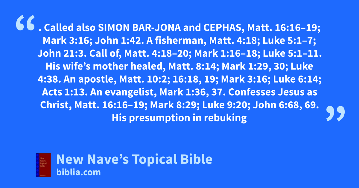 PETER. Called also Simon Bar-jona and Cephas, Matt. 16:16–19; Mark 3:16; John 1:42. A fisherman, Matt. 4:18; Luke 5:1–7; John 21:3. Call of, Matt. 4:18–20; Mark 1:16–18; Luke 5:1–11. His wife’s mother healed, Matt. 8:14; Mark 1:29, 30; Luke 4:38. An apostle, Matt. 10:2; 16:18, 19; Mark 3:16; Luke 6:14; Acts 1:13. An evangelist, Mark 1:36, 37. Confesses Jesus as Christ, Matt. 16:16–19; Mark 8:29; Luke 9:20; John 6:68, 69. His presumption in rebuking Jesus, Matt. 16:22, 23; Mark 8:32, 33; when the throng was pressing Jesus and the woman of infirmity touched him, Luke 8:45; in refusing to let Jesus wash his feet, John 13:6–11. Present at the healing of Jairus’s daughter, Mark 5:37; Luke 8:51; at the transfiguration, Matt. 17:1–4; Mark 9:2–6; Luke 9:28–33; 2 Pet. 1:16–18; in Gethsemane, Matt. 26:36–46; Mark 14:33–42; Luke 22:40–46. Seeks the interpretation of the parable of the steward, Luke 12:41; of the law of forgiveness, Matt. 18:21; of the law of defilement, Matt. 15:15; of the prophecy of Jesus concerning his second coming, Mark 13:3, 4. Walks upon the water of the sea of Galilee, Matt. 14:28–31. Sent with John to prepare the Passover, Luke 22:8. Calls attention to the withered fig tree, Mark 11:21. His denial foretold by Jesus, and his profession of fidelity, Matt. 26:33–35; Mark 14:29–31; Luke 22:31–34; John 13:36–38. Cuts off the ear of Malchus, Matt. 26:51; Mark 14:47; Luke 22:50. Follows Jesus to the high priest’s palace, Matt. 26:58; Mark 14:54; Luke 22:54; John 18:15. His denial of Jesus, and his repentance, Matt. 26:69–75; Mark 14:66–72; Luke 22:55–62; John 18:17, 18, 25–27. Visits the sepulcher, Luke 24:12; John 20:2–6. Jesus sends message to, after the resurrection, Mark 16:7. Jesus appears to, Luke 24:34; 1 Cor. 15:4, 5. Present at the Sea of Tiberias when Jesus appeared to his disciples; leaps into the sea, and comes to land when Jesus is recognized, is commissioned to feed the flock of Christ, John 21:1–23. Abides in Jerusalem, Acts 1:13. His statement before the disciples concerning the death of Judas, and his recommendation that the vacancy in the apostleship be filled, Acts 1:15–22. Preaches at Pentecost, Acts 2:14–40. Heals one crippled in the portico of the temple, Acts 3. Accused by the council; his defense, Acts 4:1–23. Foretells the death of Ananias and Sapphira, Acts 5:1–11. Imprisoned and scourged; his defense before the council, Acts 5:17–42. Goes to Samaria, Acts 8:14. Prays for the baptism of the Holy Spirit, Acts 8:15–18. Rebukes Simon, the sorcerer, who desires to purchase like power, Acts 8:18–24. Returns to Jerusalem, Acts 8:25. Receives Paul, Gal. 1:18; 2:9. Visits Lydda; heals Aeneas, Acts 9:32–34. Visits Joppa; dwells with Simon, the tanner; raises Dorcas from the dead, Acts 9:36–43. Has a vision of a sheet containing clean and unclean animals, Acts 10:9–16. Receives the servant of the centurion; goes to Caesarea; preaches and baptizes the centurion and his household, Acts 10. Advocates, in the council of the apostles and elders, the preaching of the gospel to the Gentiles, Acts 11:1–18; 15:7–11. Imprisoned and delivered by an angel, Acts 12:3–19. Writes two epistles, 1 Pet. 1:1; 2 Pet. 1:1. Miracles of, see Miracles.