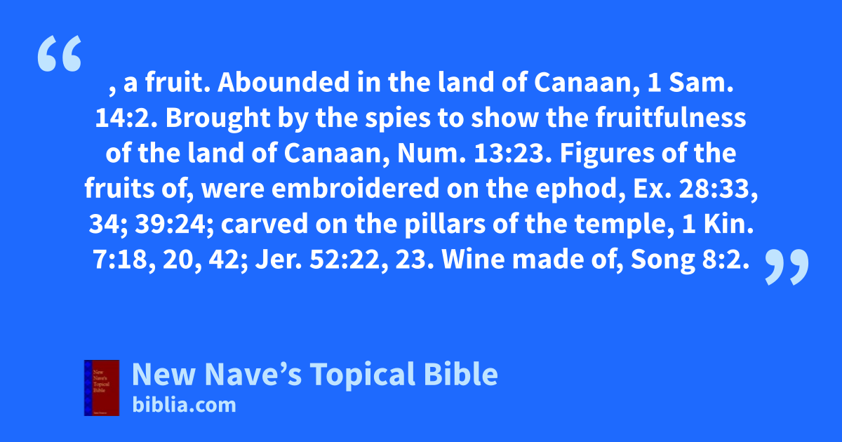 POMEGRANATE, a fruit. Abounded in the land of Canaan, 1 Sam. 14:2. Brought by the spies to show the fruitfulness of the land of Canaan, Num. 13:23. Figures of the fruits of, were embroidered on the ephod, Ex. 28:33, 34; 39:24; carved on the pillars of the temple, 1 Kin. 7:18, 20, 42; Jer. 52:22, 23. Wine made of, Song 8:2.