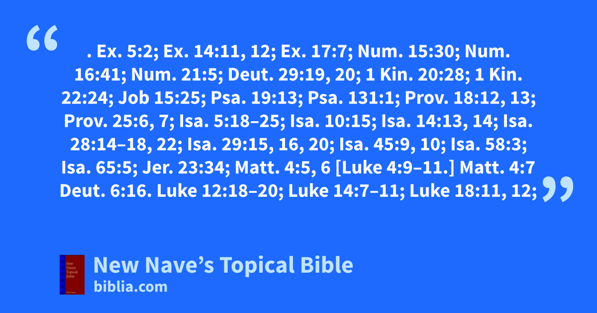PRESUMPTION. Ex. 5:2; Ex. 14:11, 12; Ex. 17:7; Num. 15:30; Num. 16:41; Num. 21:5; Deut. 29:19, 20; 1 Kin. 20:28; 1 Kin. 22:24; Job 15:25; Psa. 19:13; Psa. 131:1; Prov. 18:12, 13; Prov. 25:6, 7; Isa. 5:18–25; Isa. 10:15; Isa. 14:13, 14; Isa. 28:14–18, 22; Isa. 29:15, 16, 20; Isa. 45:9, 10; Isa. 58:3; Isa. 65:5; Jer. 23:34; Matt. 4:5, 6 [Luke 4:9–11.] Matt. 4:7 Deut. 6:16. Luke 12:18–20; Luke 14:7–11; Luke 18:11, 12; Rom. 1:32; Rom. 9:20, 21; 1 Cor. 10:9–12; 2 Thess. 2:3, 4; Jas. 4:13–16; 2 Pet. 2:10, 11