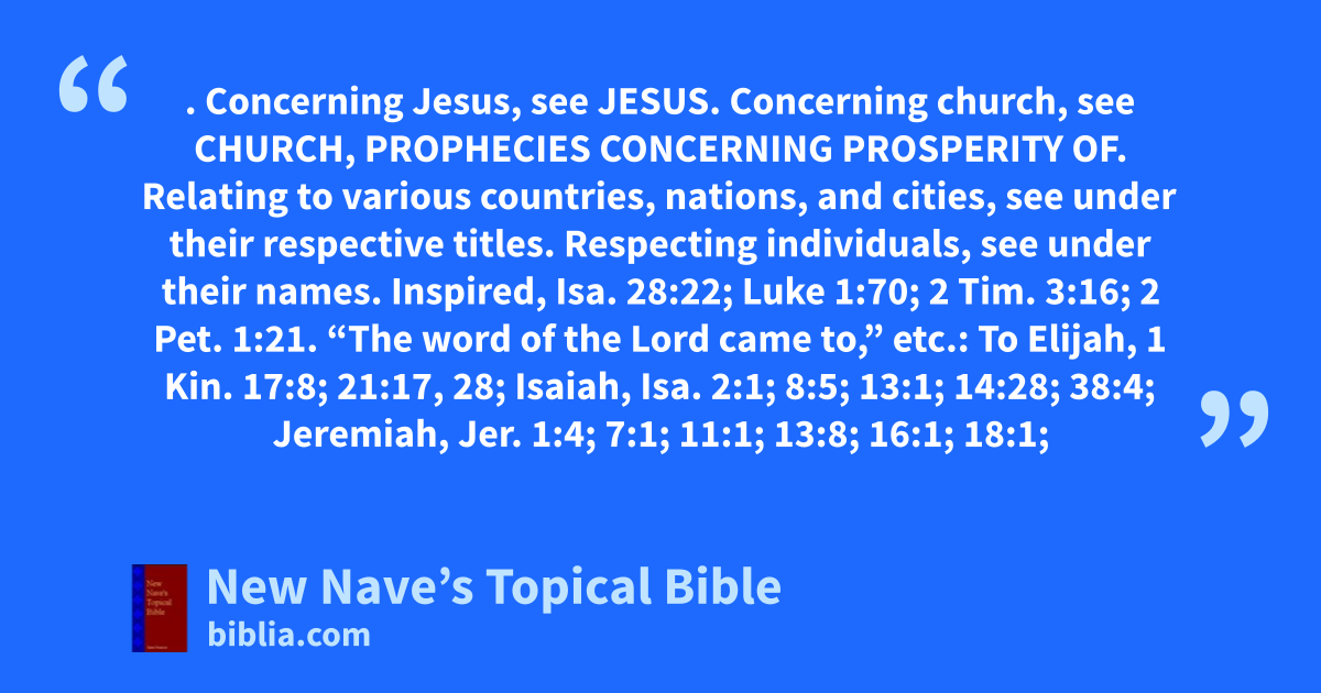 PROPHECY. Concerning Jesus, see Jesus. Concerning church, see Church, Prophecies Concerning Prosperity of. Relating to various countries, nations, and cities, see under their respective titles. Respecting individuals, see under their names. Inspired, Isa. 28:22; Luke 1:70; 2 Tim. 3:16; 2 Pet. 1:21. “The word of the Lord came to,” etc.: To Elijah, 1 Kin. 17:8; 21:17, 28; Isaiah, Isa. 2:1; 8:5; 13:1; 14:28; 38:4; Jeremiah, Jer. 1:4; 7:1; 11:1; 13:8; 16:1; 18:1; 25:1, 2; 26:1; 27:1; 29:30; 30:1, 4; 32:1, 6, 26; 33:1, 19, 23; 34:12; 35:12; 36:1; 37:6; 40:1; 43:8; 44:1; 46:1; 49:34; 50:1; Ezekiel, Ezek. 3:16; 6:1; 7:1; 11:14; 12:1, 8, 17, 21; 13:1; 14:12; 15:1; 16:1; 17:1, 11; 18:1; 20:45; 21:1, 8, 18; 22:1, 17, 23; 23:1; 24:1, 15, 20; 25:1; 26:1; 27:1; 28:1, 11, 20; 29:1, 17; 30:1, 20; 31:1; 32:1, 17; 33:1, 23; 34:1; 35:1; 36:16; 37:15; 38:1; Amos, Amos 7:14, 15; Jonah, Jonah 3:1; Haggai, Hag. 2:1, 10, 20; Zechariah, Zech. 1:7; 4:8; 6:9; 7:1, 4, 8; 8:1, 18. Publicly proclaimed, Jer. 11:6. Exemplified in pantomime, Ezek. 4; 5:1–4; Acts 21:11. Written by an amanuensis, Jer. 45:1; in books, Jer. 45:1; 51:60. Proof of God’s foreknowledge, Isa. 43:9. Sure fulfillment of, Ezek. 12:22–25, 28; Hab. 2:3; Matt. 5:18; 24:35; Acts 13:27, 29. Cessation of, Lam. 2:9. Of apostasy, 1 John 2:18; Jude 17, 18; false teachers, 2 Pet. 2:3. Tribulations of the righteous, Rev. 2:10.