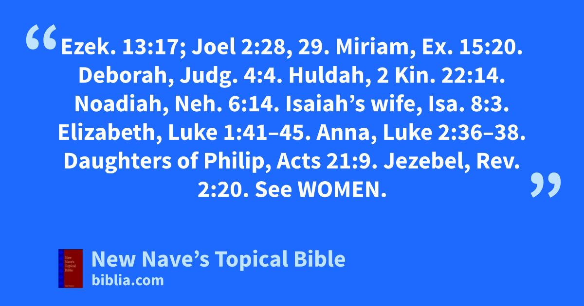 PROPHETESSES: Ezek. 13:17; Joel 2:28, 29. Miriam, Ex. 15:20. Deborah, Judg. 4:4. Huldah, 2 Kin. 22:14. Noadiah, Neh. 6:14. Isaiah’s wife, Isa. 8:3. Elizabeth, Luke 1:41–45. Anna, Luke 2:36–38. Daughters of Philip, Acts 21:9. Jezebel, Rev. 2:20. See Women.