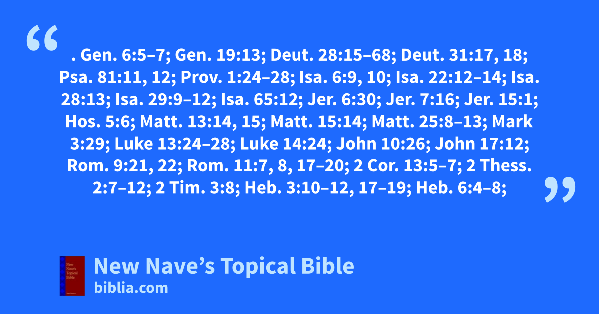 REPROBACY. Gen. 6:5–7; Gen. 19:13; Deut. 28:15–68; Deut. 31:17, 18; Psa. 81:11, 12; Prov. 1:24–28; Isa. 6:9, 10; Isa. 22:12–14; Isa. 28:13; Isa. 29:9–12; Isa. 65:12; Jer. 6:30; Jer. 7:16; Jer. 15:1; Hos. 5:6; Matt. 13:14, 15; Matt. 15:14; Matt. 25:8–13; Mark 3:29; Luke 13:24–28; Luke 14:24; John 10:26; John 17:12; Rom. 9:21, 22; Rom. 11:7, 8, 17–20; 2 Cor. 13:5–7; 2 Thess. 2:7–12; 2 Tim. 3:8; Heb. 3:10–12, 17–19; Heb. 6:4–8; Heb. 10:26–31; Heb. 12:15–17; 1 John 5:16; Jude 4–13; Rev. 22:11 See Hardness of Heart.