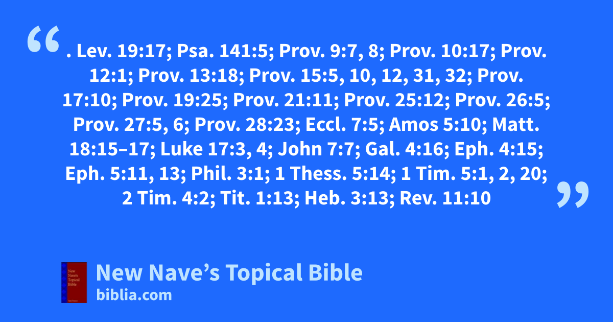 REPROOF. Lev. 19:17; Psa. 141:5; Prov. 9:7, 8; Prov. 10:17; Prov. 12:1; Prov. 13:18; Prov. 15:5, 10, 12, 31, 32; Prov. 17:10; Prov. 19:25; Prov. 21:11; Prov. 25:12; Prov. 26:5; Prov. 27:5, 6; Prov. 28:23; Eccl. 7:5; Amos 5:10; Matt. 18:15–17; Luke 17:3, 4; John 7:7; Gal. 4:16; Eph. 4:15; Eph. 5:11, 13; Phil. 3:1; 1 Thess. 5:14; 1 Tim. 5:1, 2, 20; 2 Tim. 4:2; Tit. 1:13; Heb. 3:13; Rev. 11:10