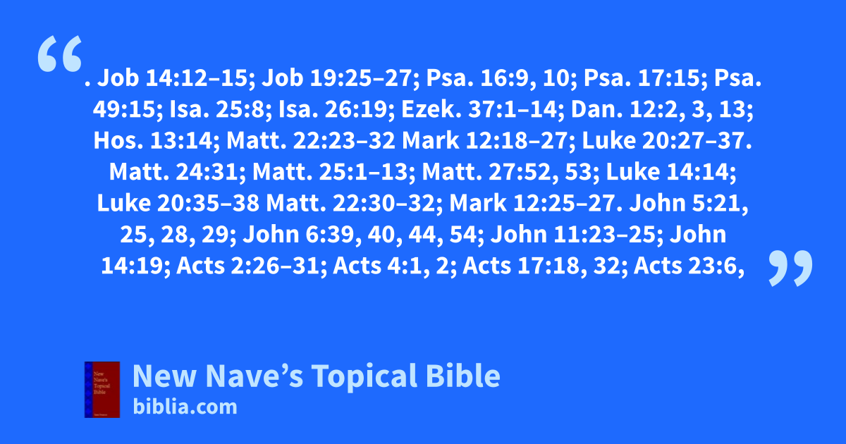 RESURRECTION. Job 14:12–15; Job 19:25–27; Psa. 16:9, 10; Psa. 17:15; Psa. 49:15; Isa. 25:8; Isa. 26:19; Ezek. 37:1–14; Dan. 12:2, 3, 13; Hos. 13:14; Matt. 22:23–32 Mark 12:18–27; Luke 20:27–37. Matt. 24:31; Matt. 25:1–13; Matt. 27:52, 53; Luke 14:14; Luke 20:35–38 Matt. 22:30–32; Mark 12:25–27. John 5:21, 25, 28, 29; John 6:39, 40, 44, 54; John 11:23–25; John 14:19; Acts 2:26–31; Acts 4:1, 2; Acts 17:18, 32; Acts 23:6, 8; Acts 24:14, 15; Acts 26:6–8; Rom. 4:16–21; Rom. 8:10, 11, 19, 21–23; 1 Cor. 6:14; 1 Cor. 15:12–32, 35–57; 2 Cor. 4:14; 2 Cor. 5:1–5; Phil. 3:10, 11, 21; 1 Thess. 4:14, 16; 2 Tim. 1:10; 2 Tim. 2:18; Heb. 6:2; Heb. 11:19, 35; Rev. 1:18; Rev. 20:4–6, 13 See Dead, Raised; of Jesus, see Jesus.